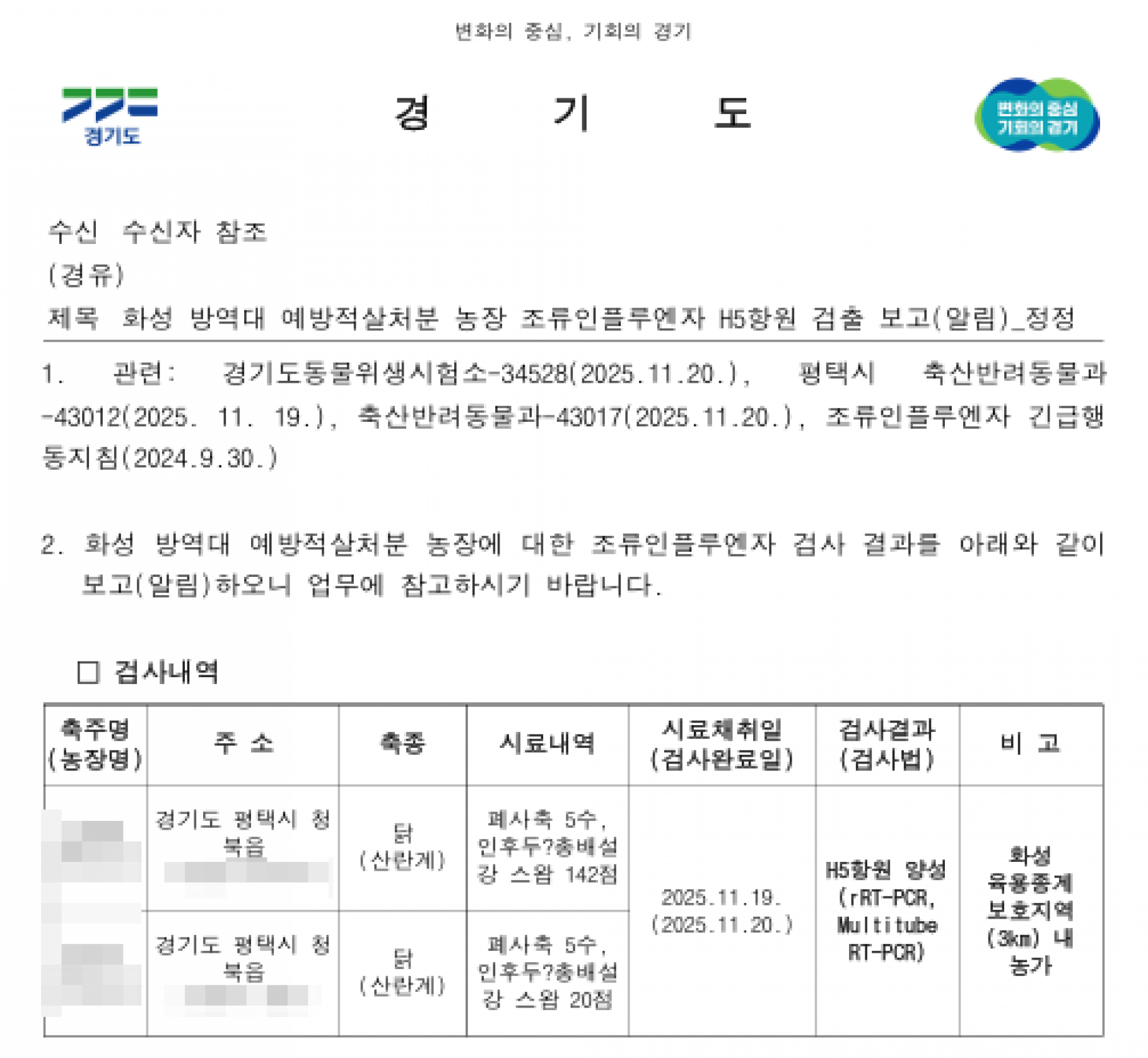 경기 평택 예방적 살처분 가금농장(산란계) 고병원성 AI 의사환축 발생에 따른 방역강화 조치
