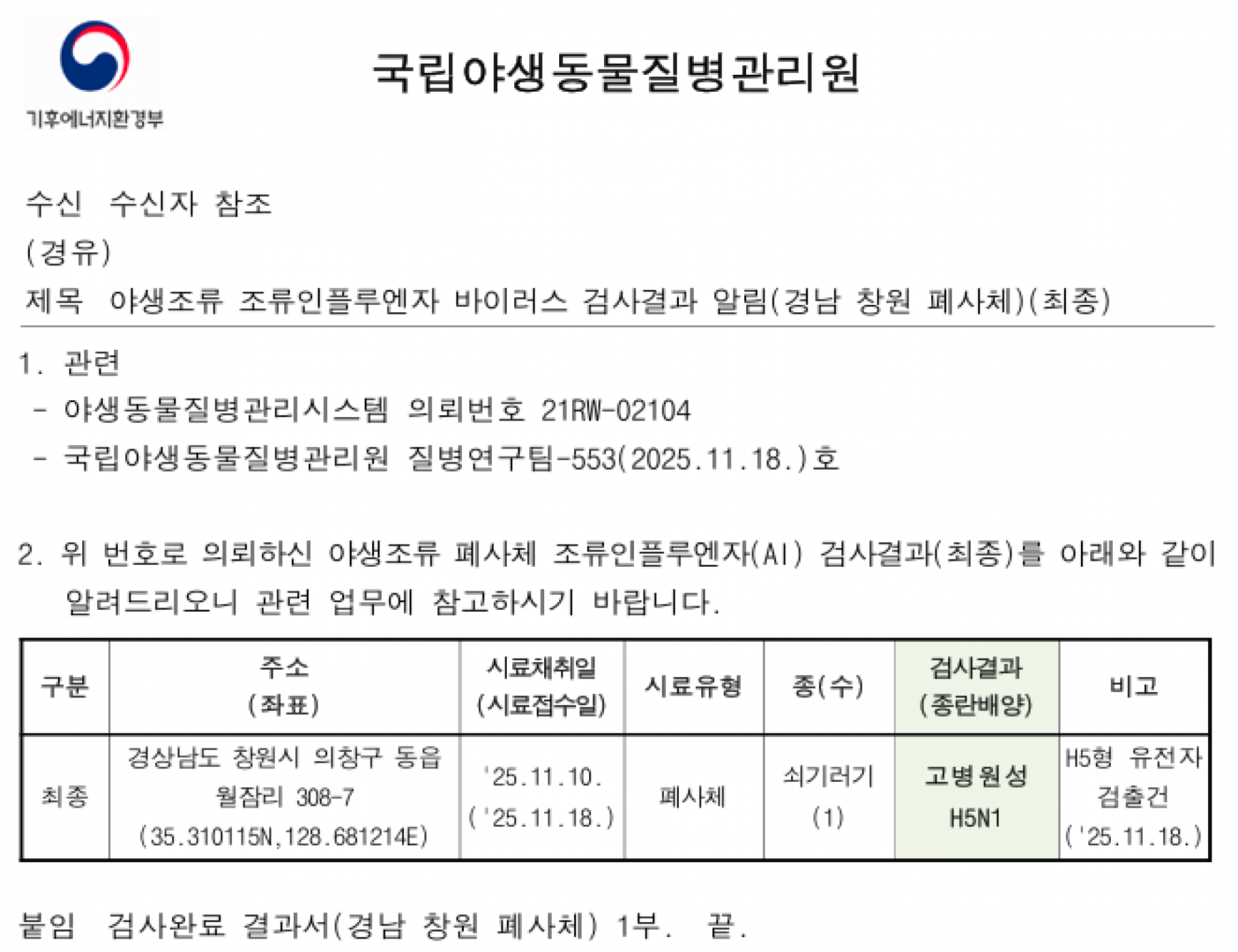 (경남 창원)야생조류 고병원성 조류인플루엔자(H5형) 검출에 따른 차단방역 강화 알림