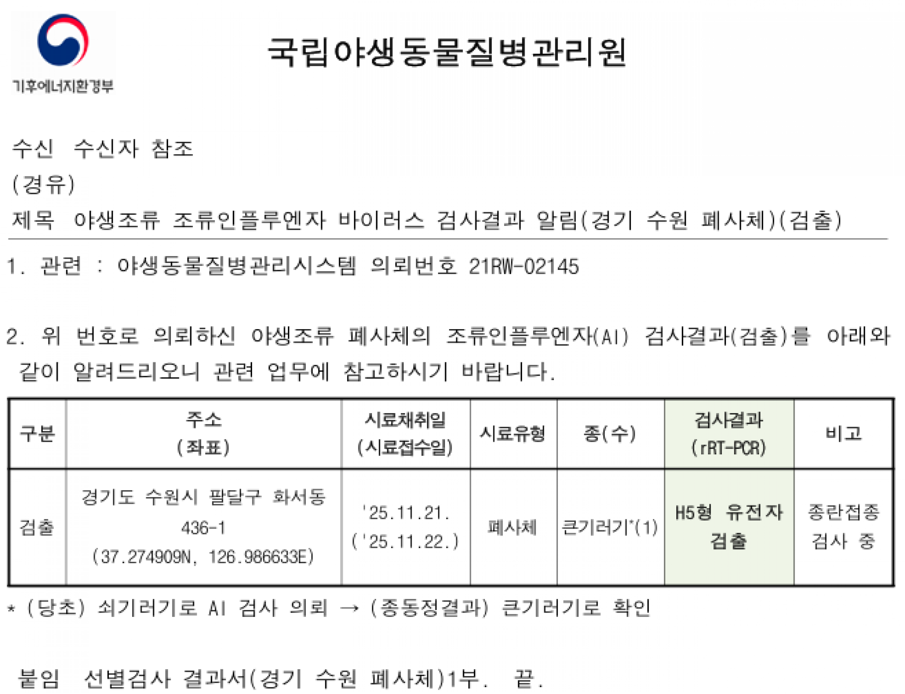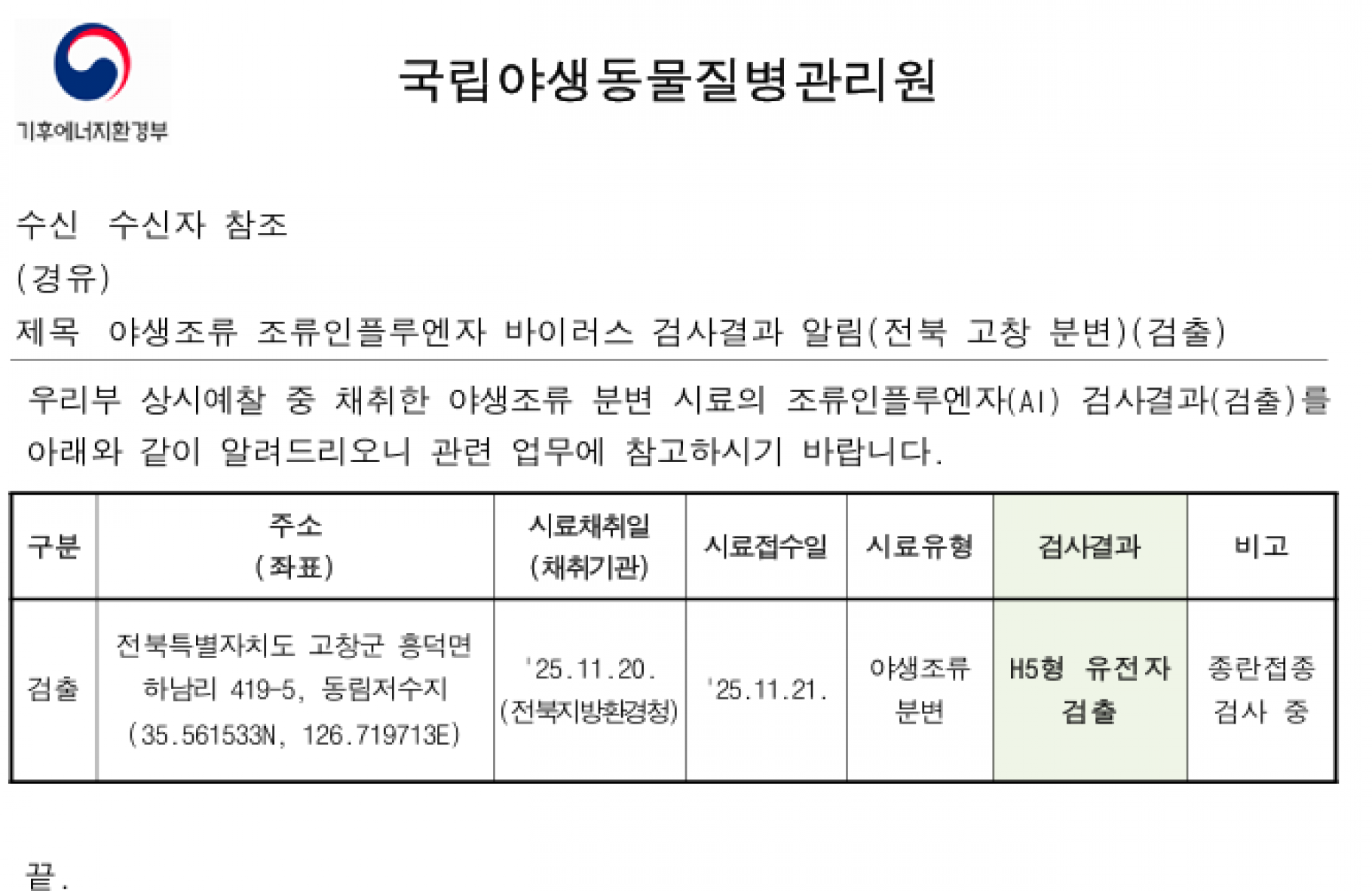 (경기 수원, 전북 고창)야생조류 조류인플루엔자(H5) 항원 검출에 따른 차단방역 및 예찰 강화 알림