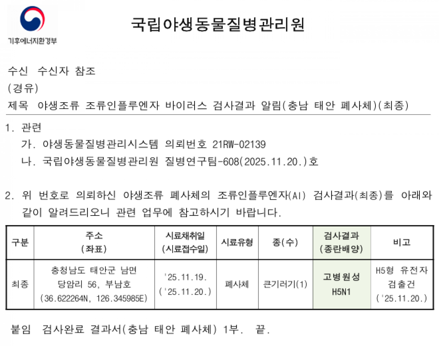 (충남 태안)야생조류 고병원성 조류인플루엔자(H5형) 검출에 따른 차단방역 강화 알림