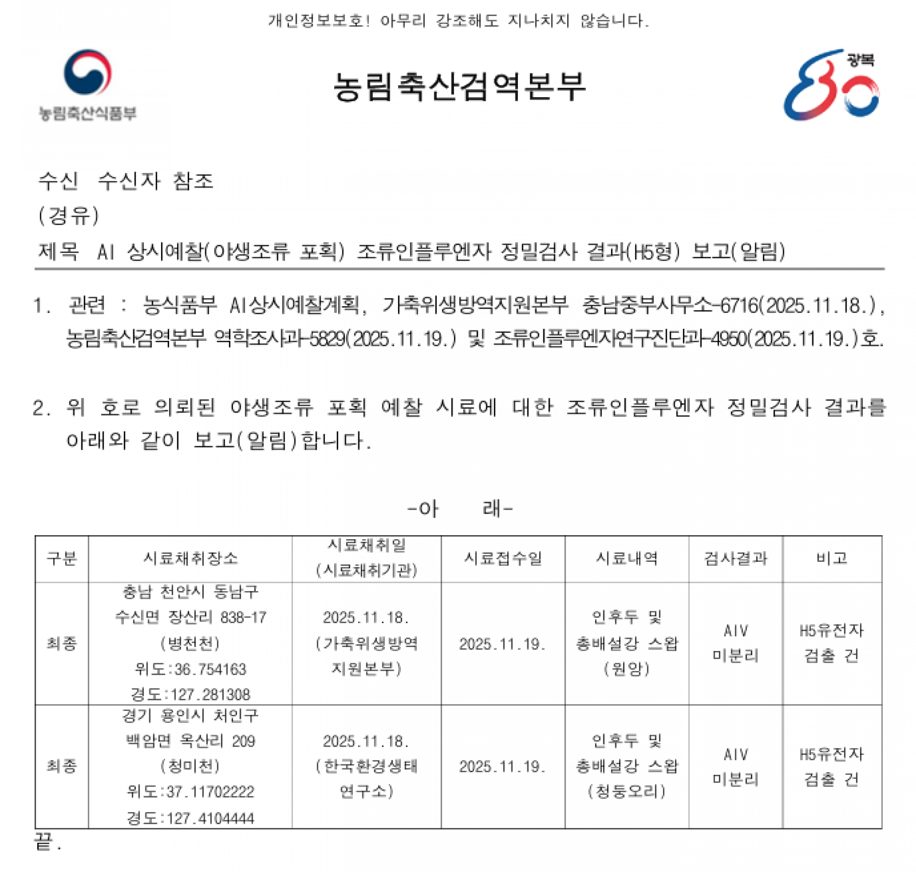 (경기 용인, 충남 천안) 야생조류 AI 항원 미분리 지점 관리에 대한 후속조치 알림