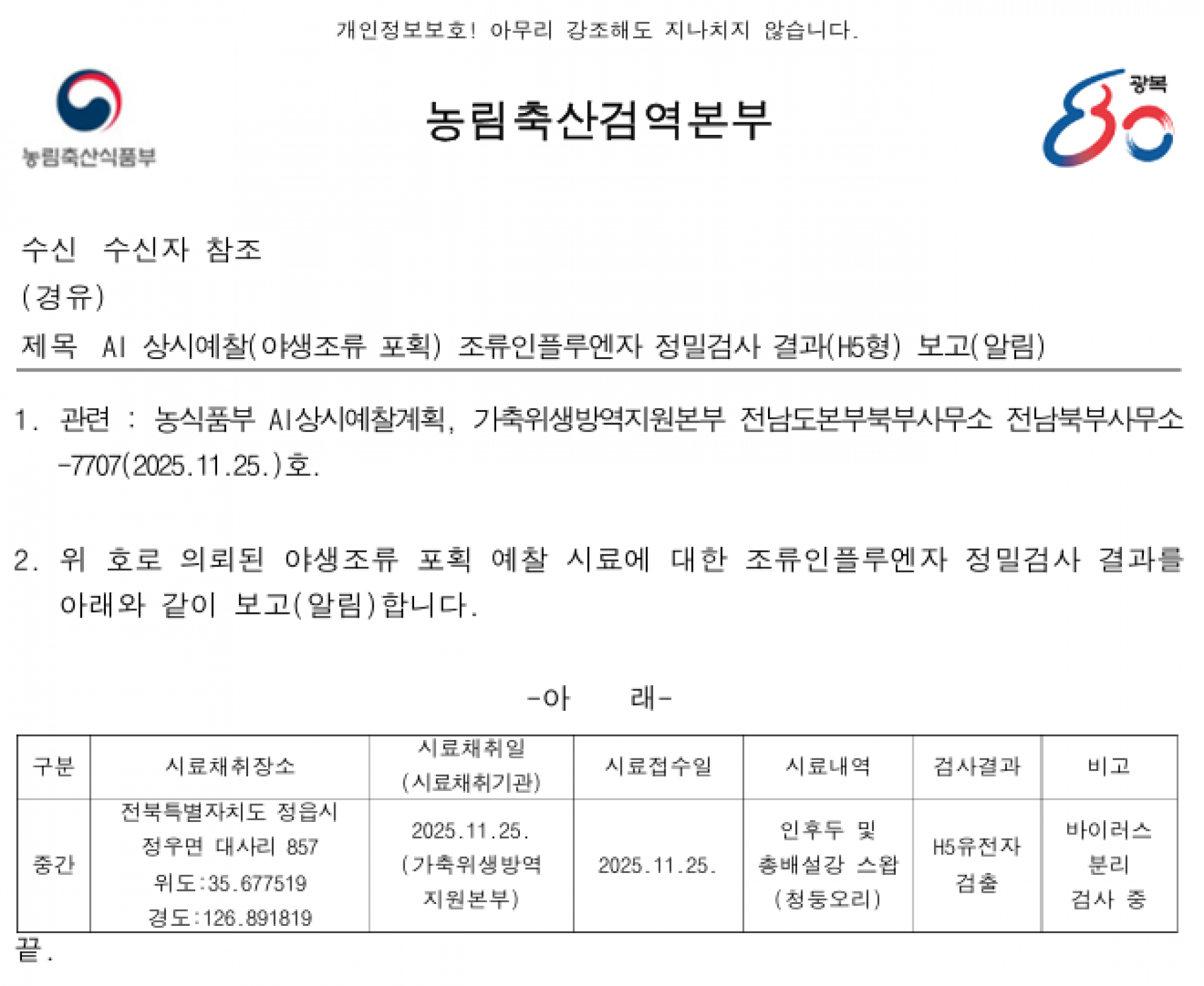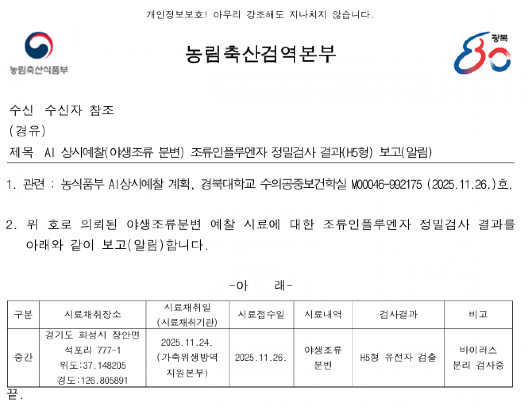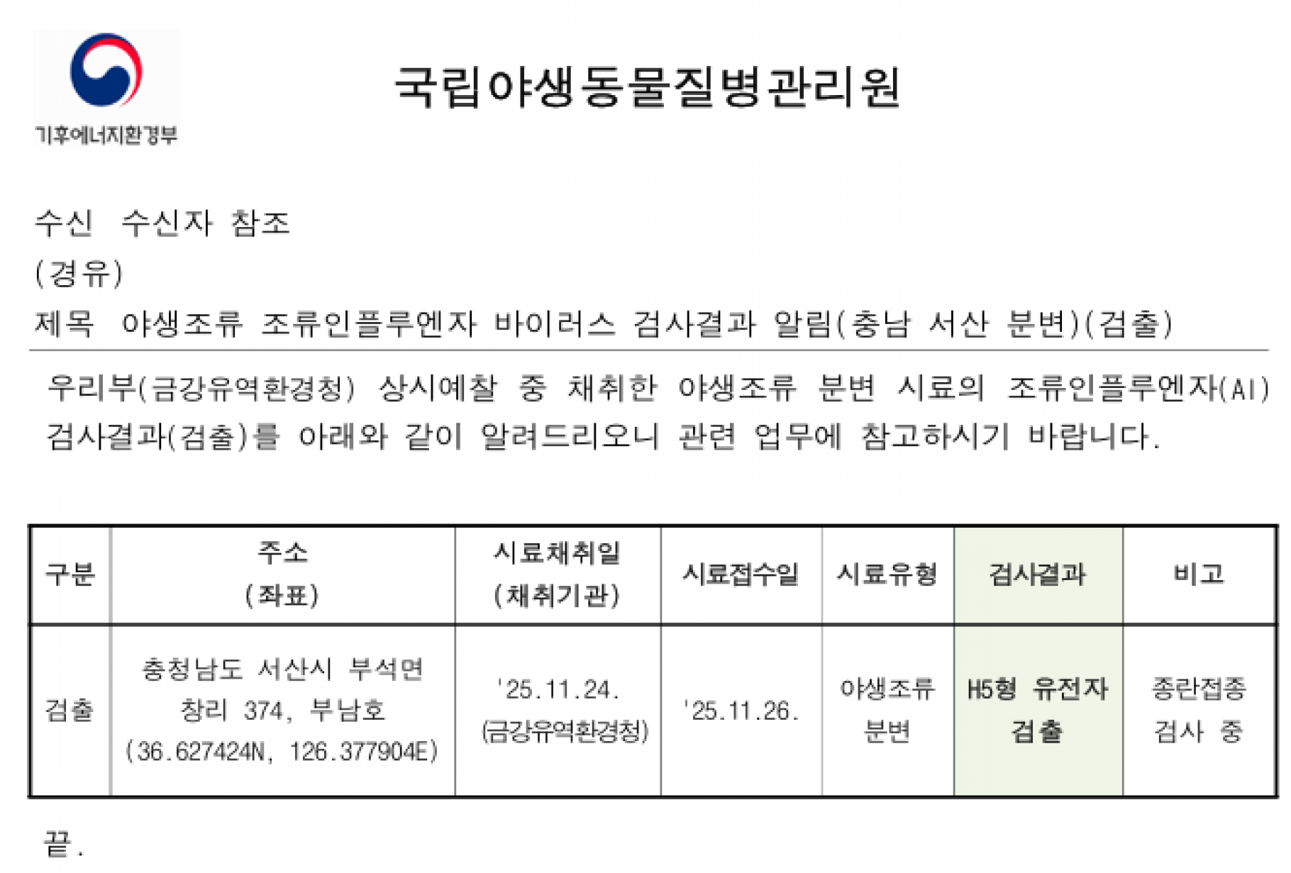 (경기 화성, 전북 정읍, 충남 서산) 야생조류 조류인플루엔자(H5) 항원 검출에 따른 차단방역 및 예찰 강화 알림
