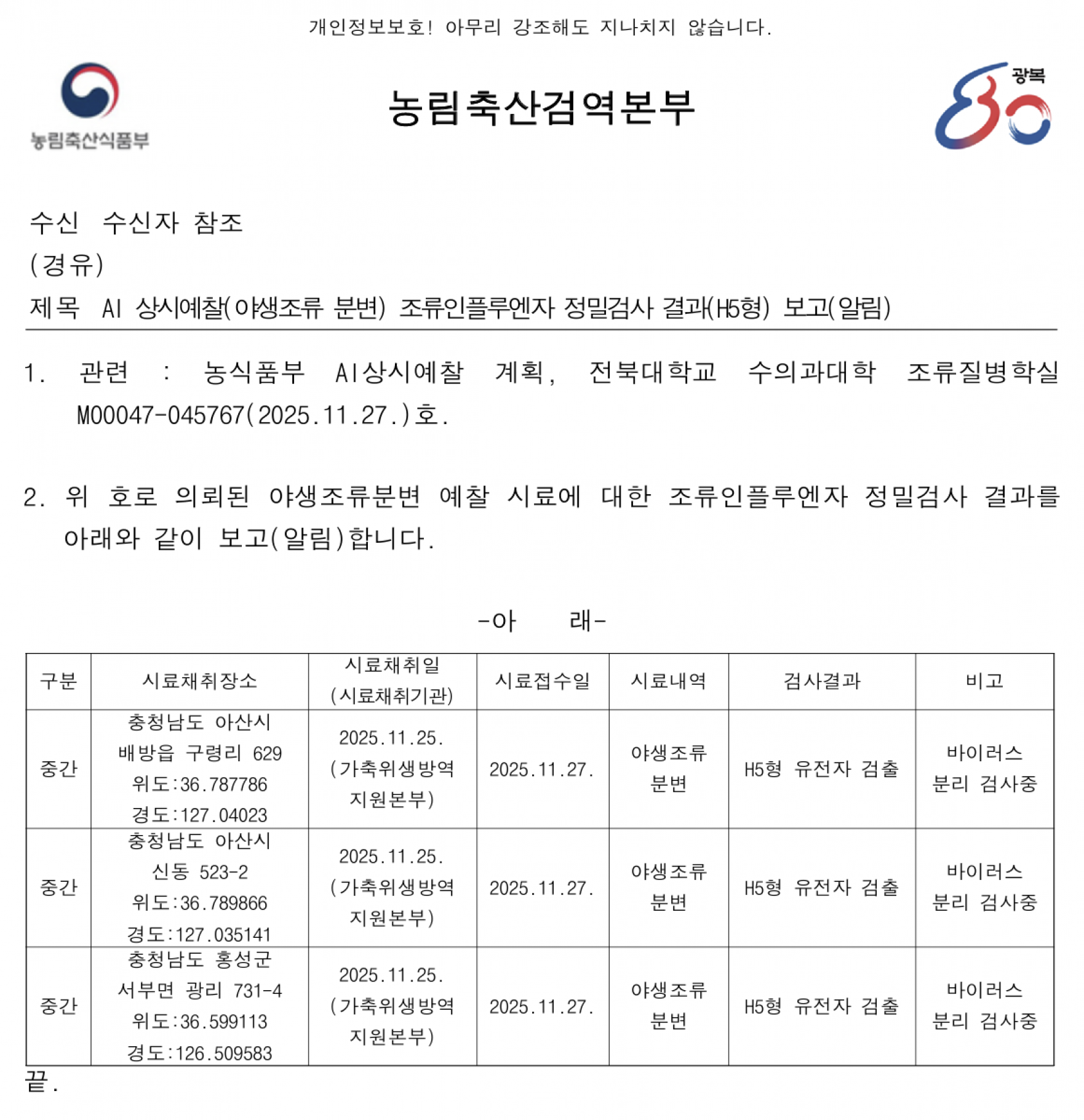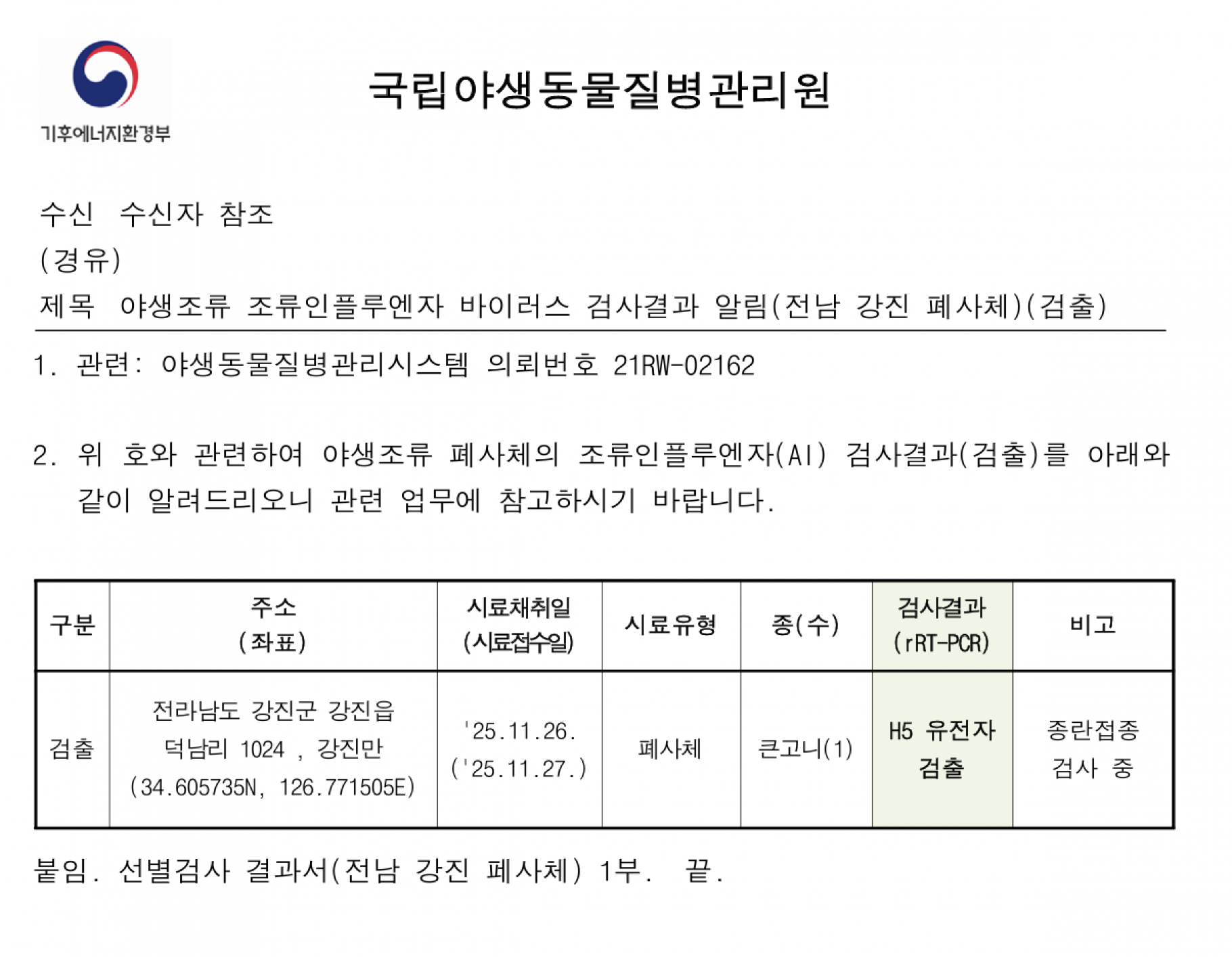 (전남 강진, 충남 아산, 충남 홍성) 야생조류 조류인플루엔자(H5) 항원 검출에 따른 차단방역 및 예찰 강화 알림