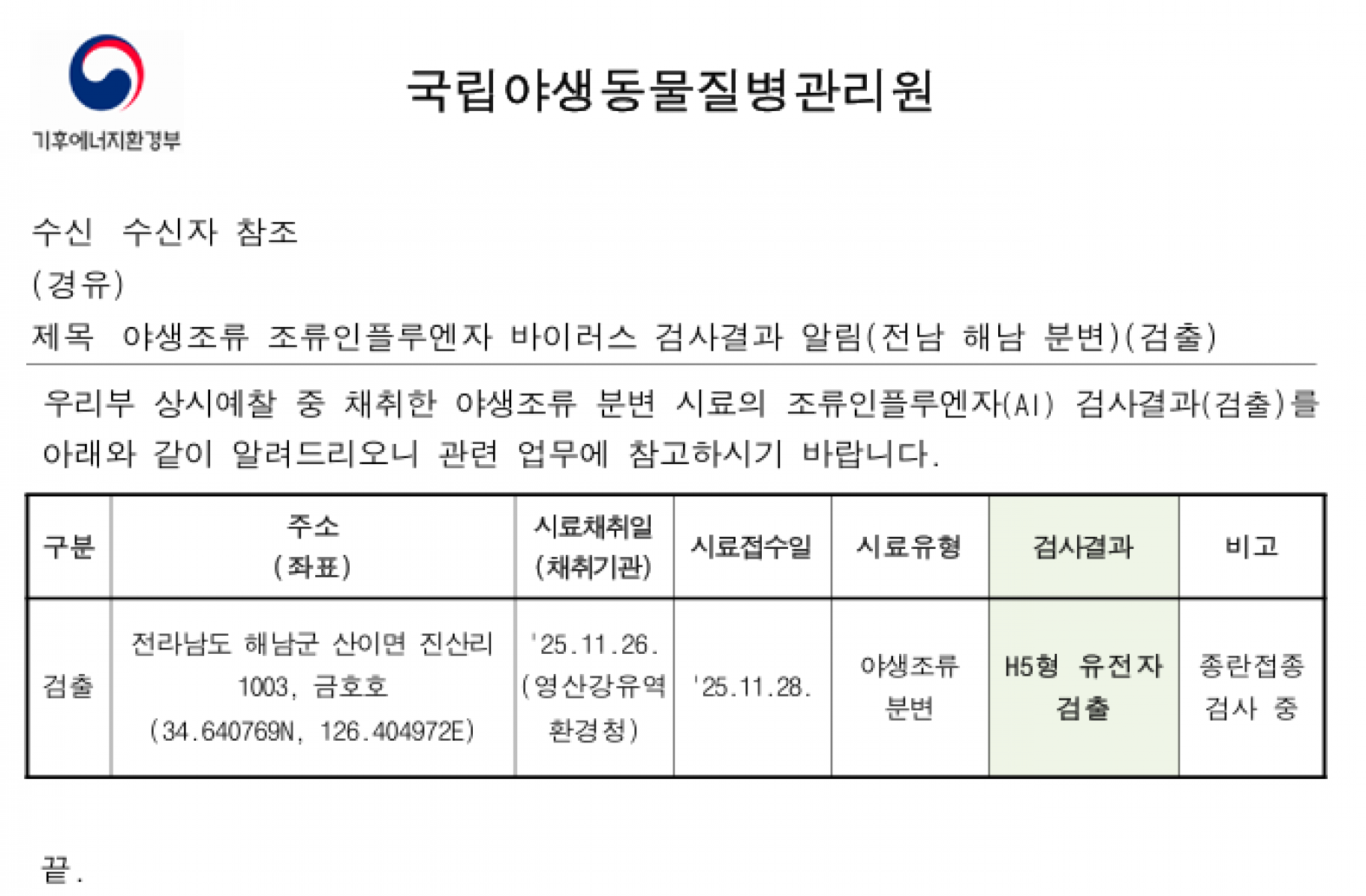 (전남 해남군) 야생조류 조류인플루엔자(H5) 항원 검출에 따른 차단방역 및 예찰 강화 알림