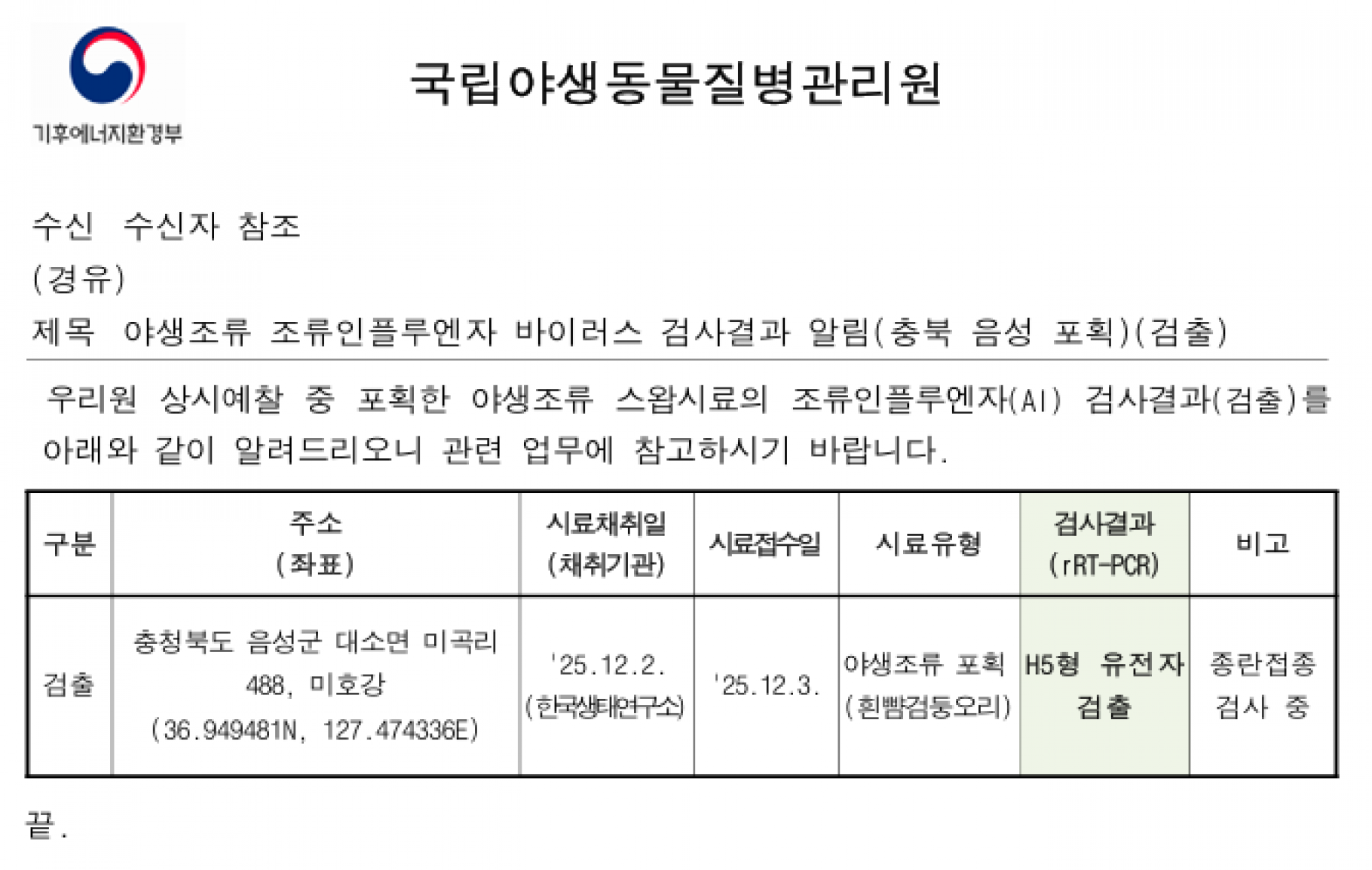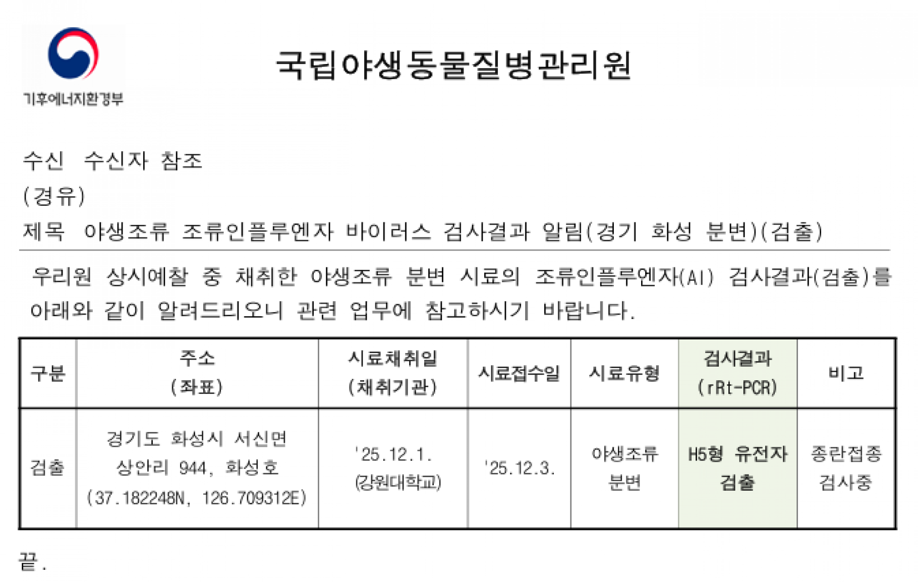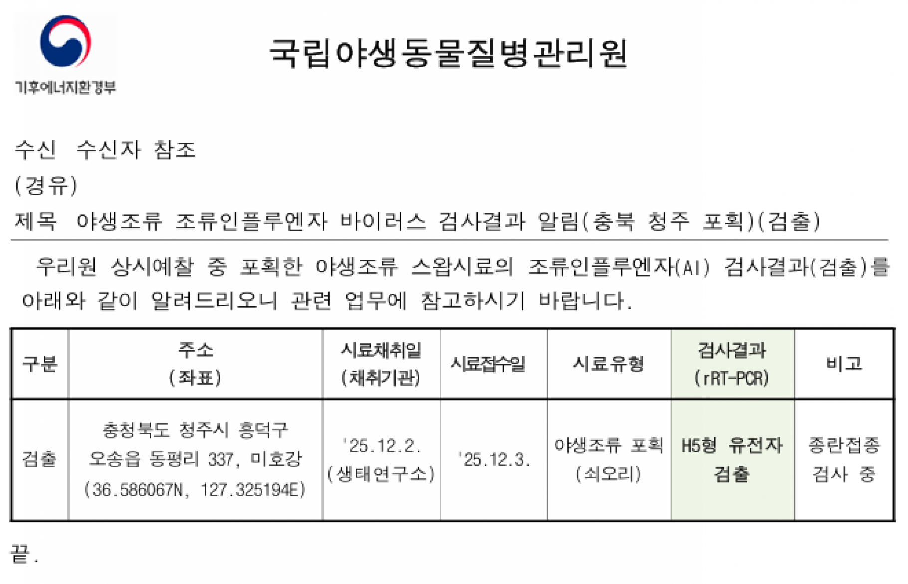 (경기도 화성, 충북 음성, 청주) 야생조류 조류인플루엔자(H5) 항원 검출에 따른 차단방역 및 예찰 강화 알림