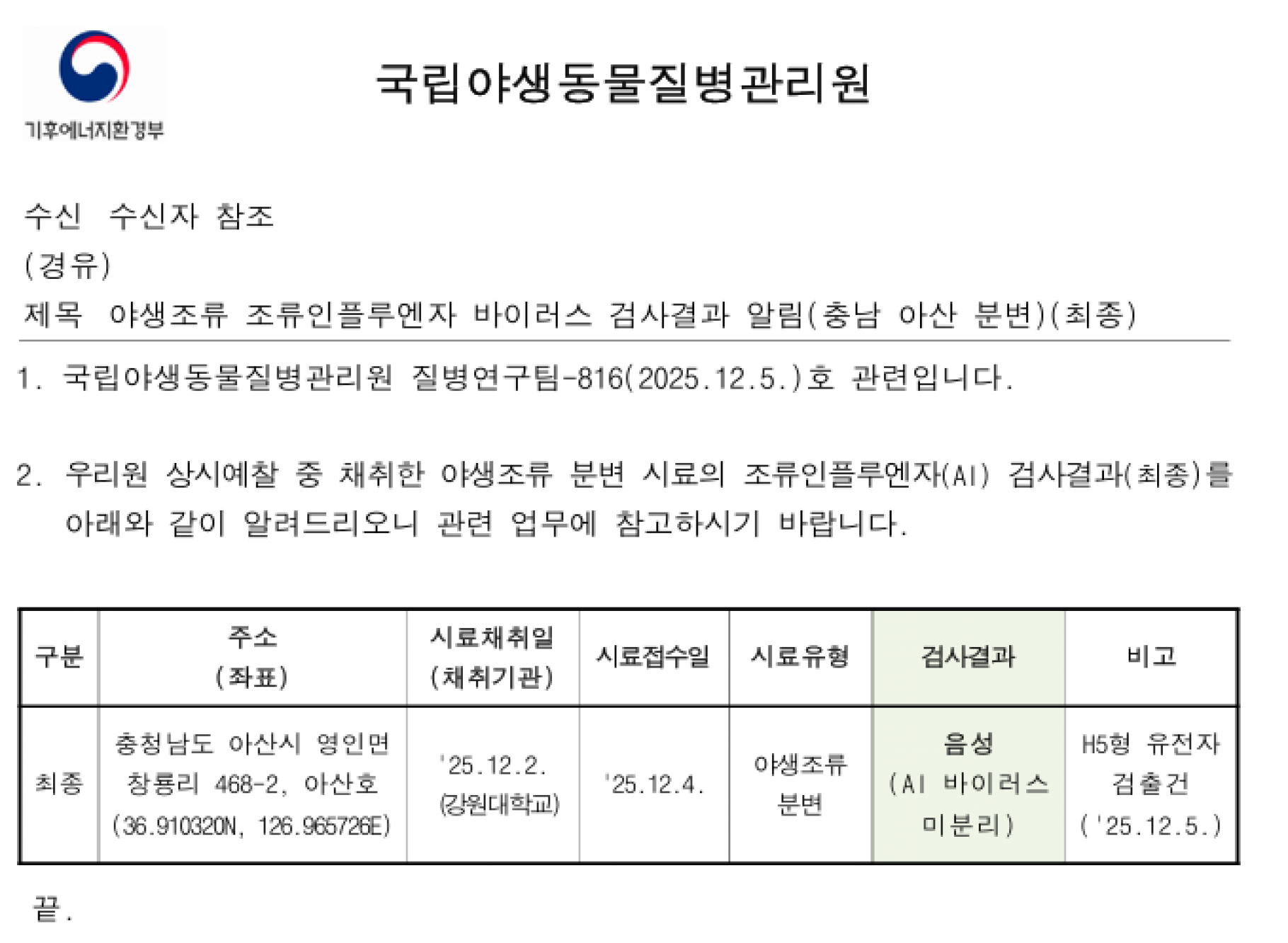 충남(아산) 소재 야생조류 AI 항원 미분리 지점 관리에 대한 후속조치 알림