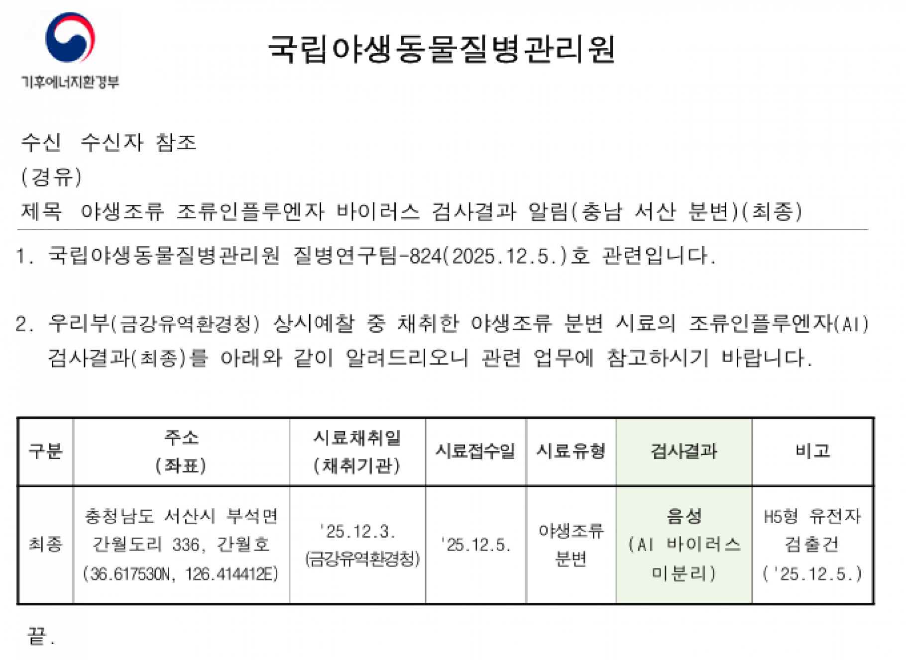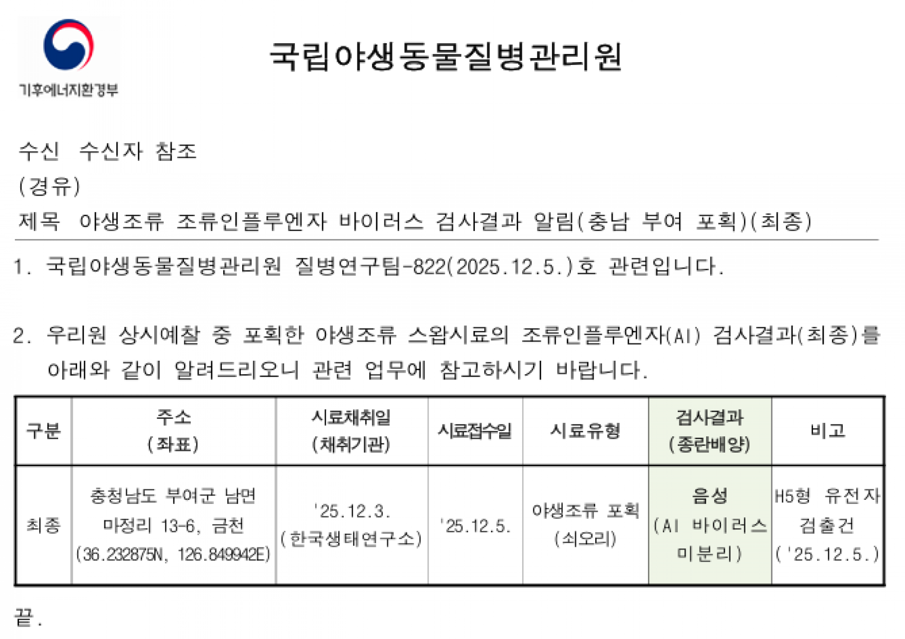 충남(부여) 및 충남(서산) 소재 야생조류 AI 항원 미분리 지점 관리에 대한 후속조치 알림