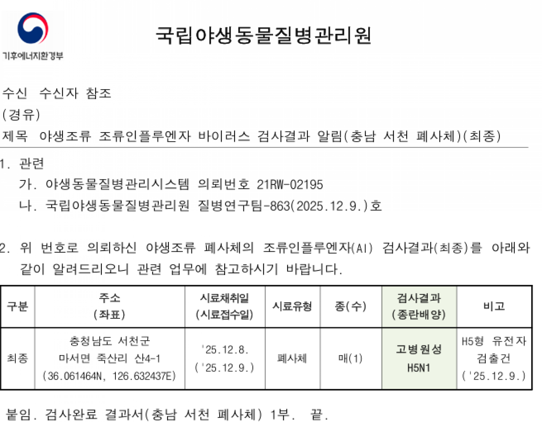 (충남 서천) 야생조류 고병원성 조류인플루엔자(H5형) 검출에 따른 차단방역 강화 알림