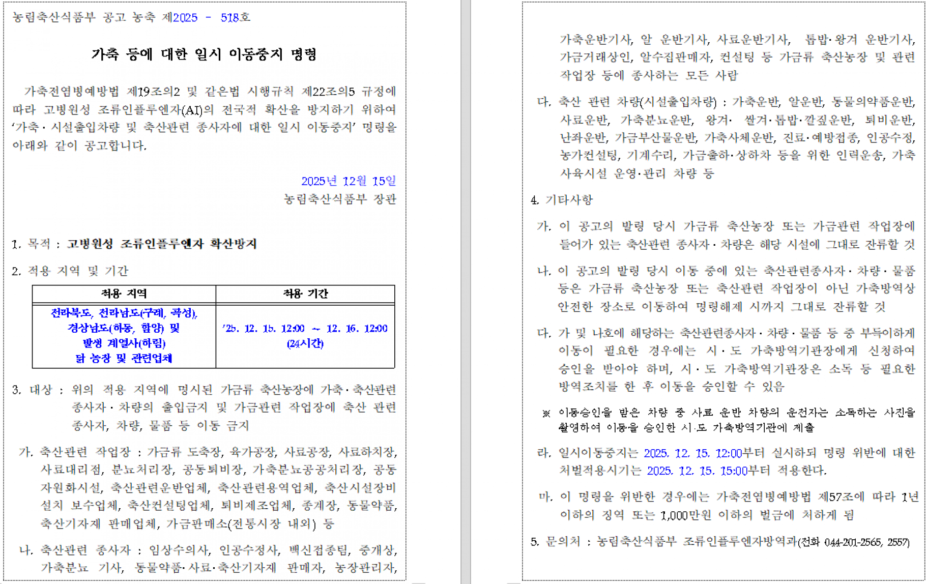 가축(닭) 등에 대한 일시 이동중지(Standstill) 명령 발령 알림