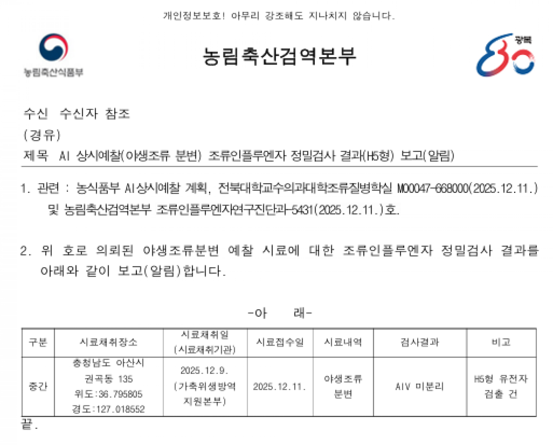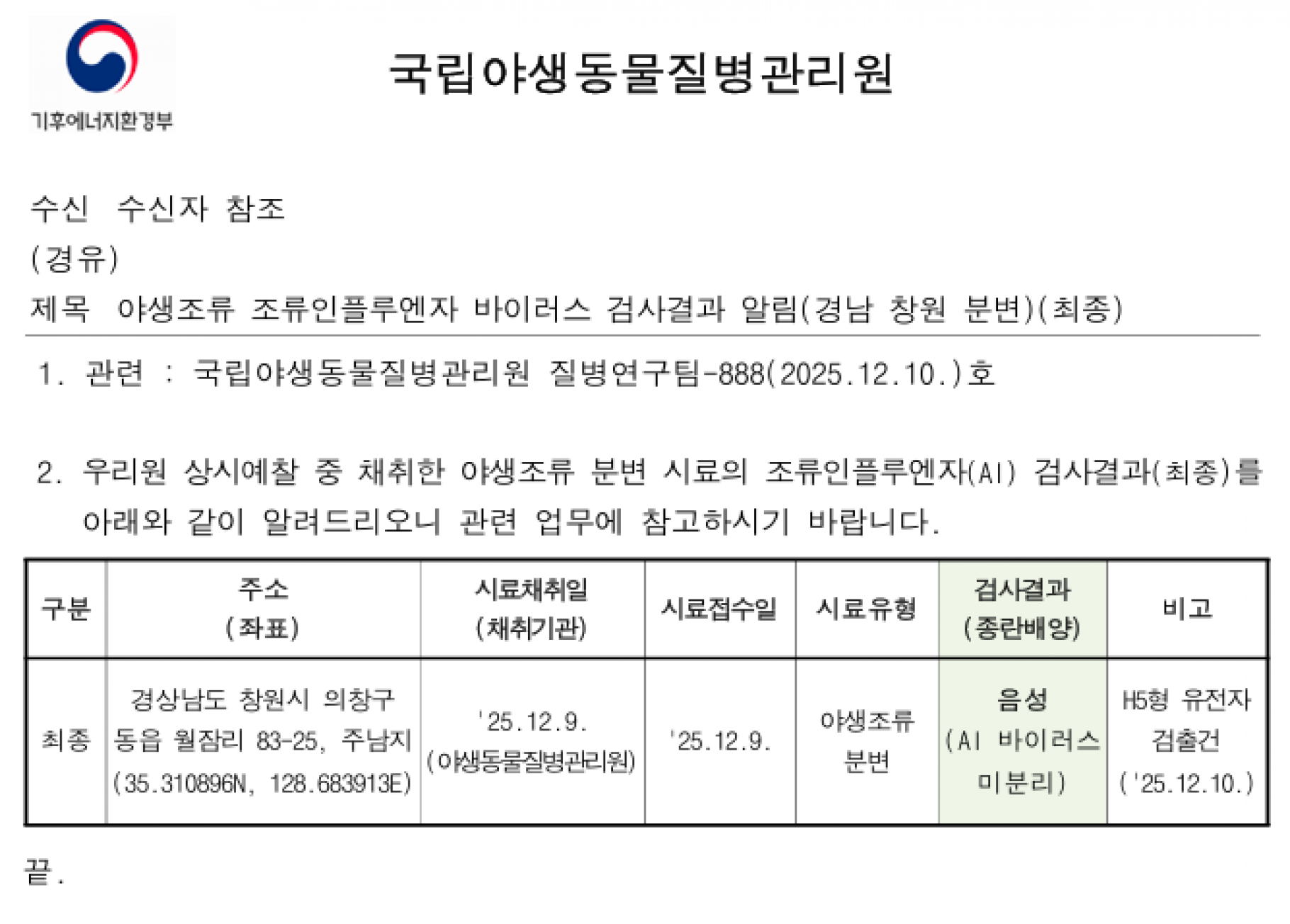 충남(아산) 및 경남(창원) 소재 야생조류 AI 항원 미분리 지점 관리에 대한 후속조치 알림