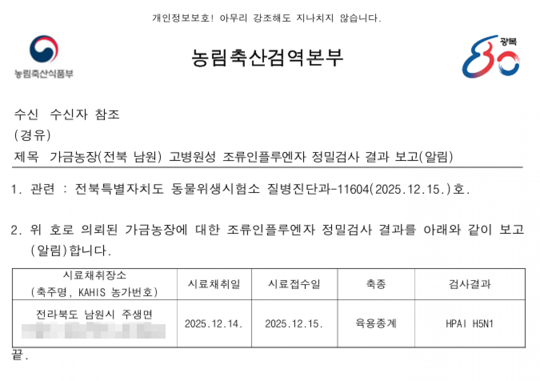 전북 남원 가금농장(육용종계) 고병원성 조류인플루엔자(AI) 확진에 따른 방역조치 알림