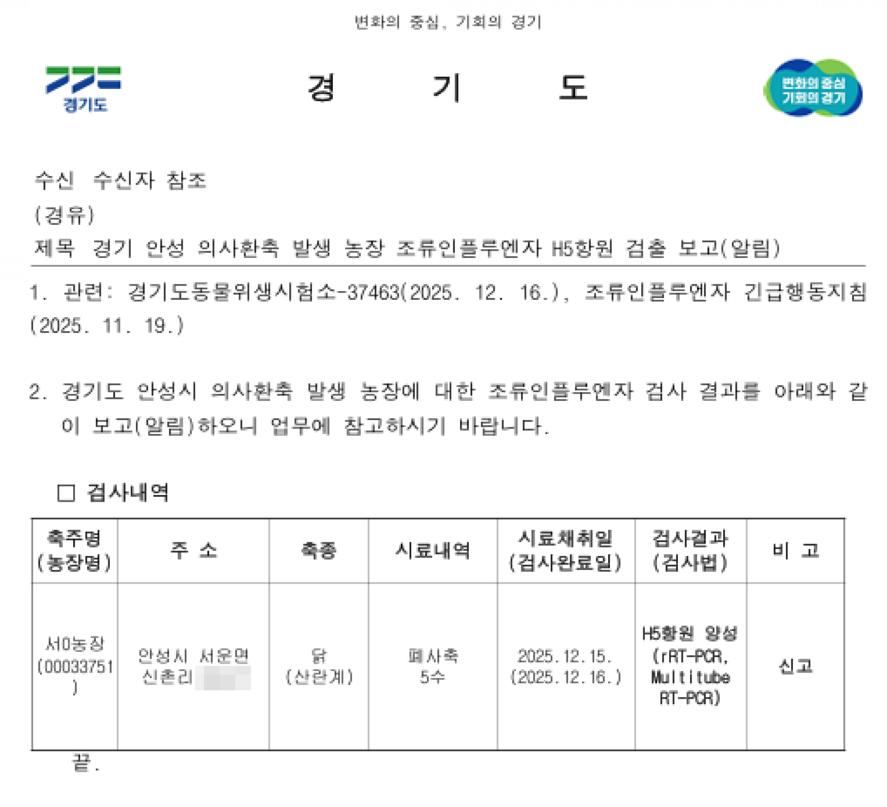 경기 안성 가금농장(산란계) 고병원성 AI 의사환축 발생에 따른 방역강화 조치