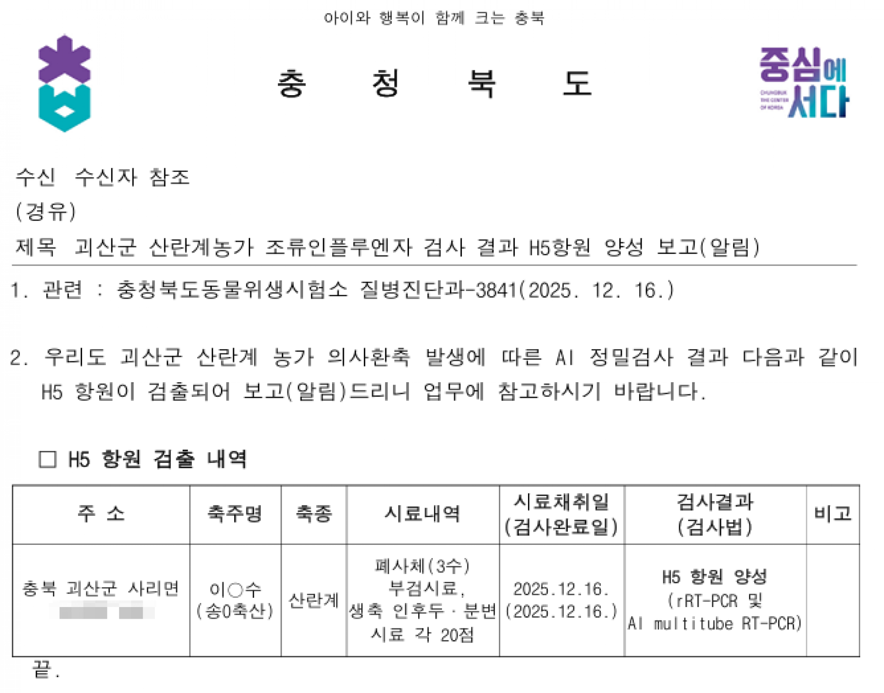 충북 괴산 가금농장(산란계) 고병원성 AI 의사환축 발생에 따른 방역강화 조치