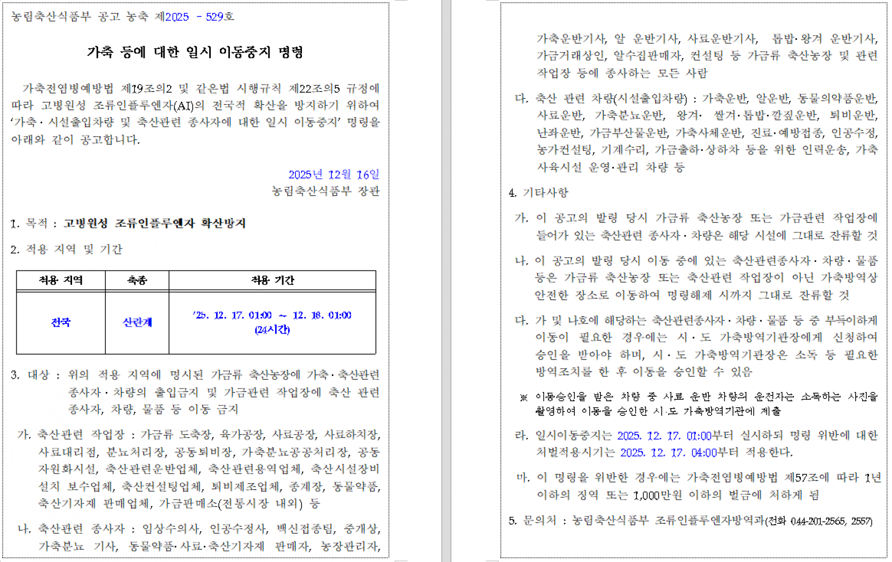 가축(산란계) 등에 대한 일시 이동중지(Standstill) 명령 발령 알림