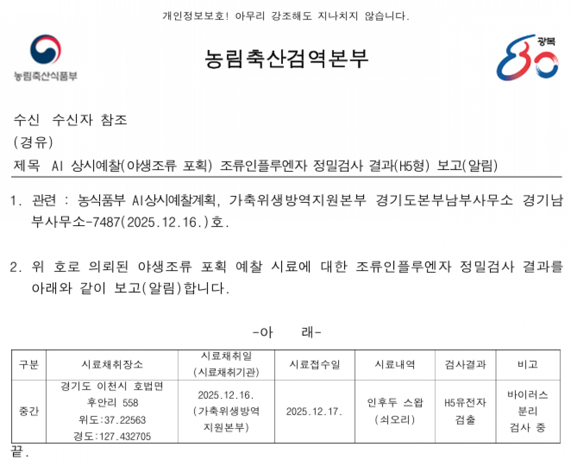 (경기도 이천)야생조류 조류인플루엔자(H5) 항원 검출에 따른 차단방역 및 예찰 강화 알림
