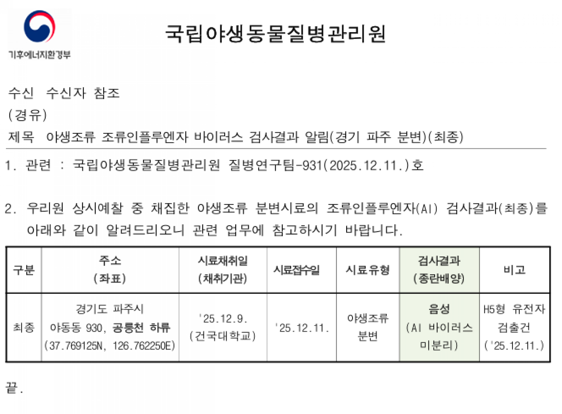 경기(파주) 소재 야생조류 AI 항원 미분리 지점 관리에 대한 후속조치 알림