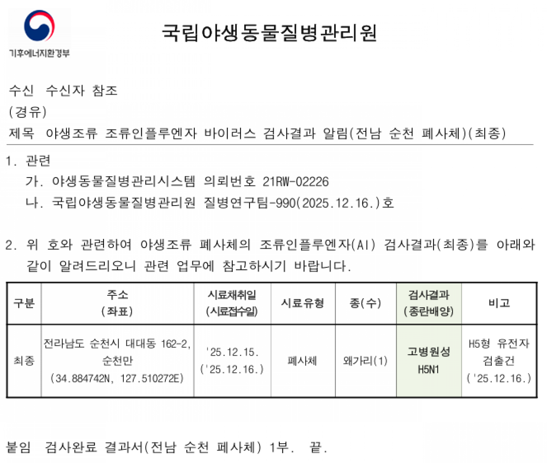 (전남 순천) 야생조류 고병원성 조류인플루엔자(H5형) 검출에 따른 차단방역 강화 알림