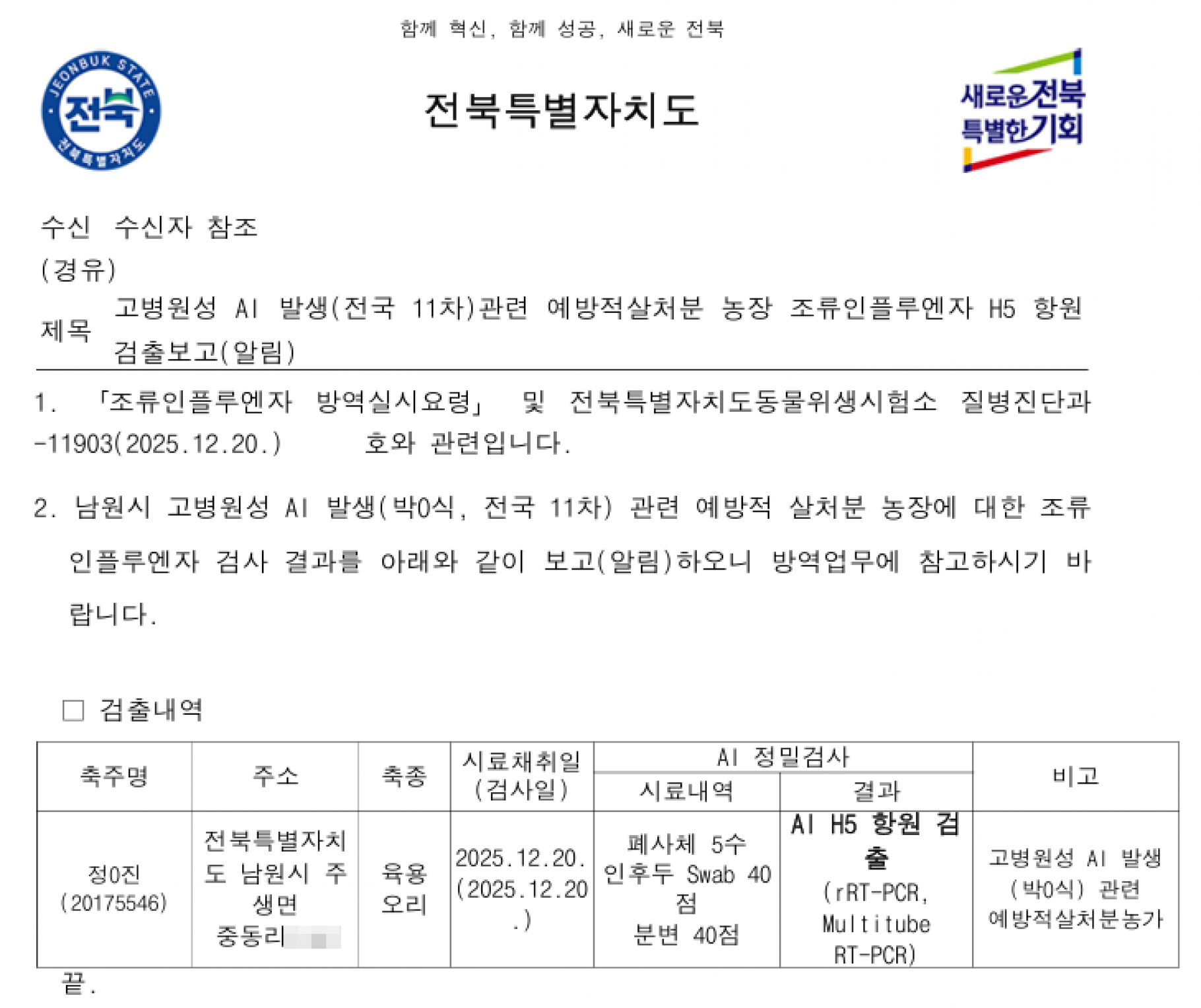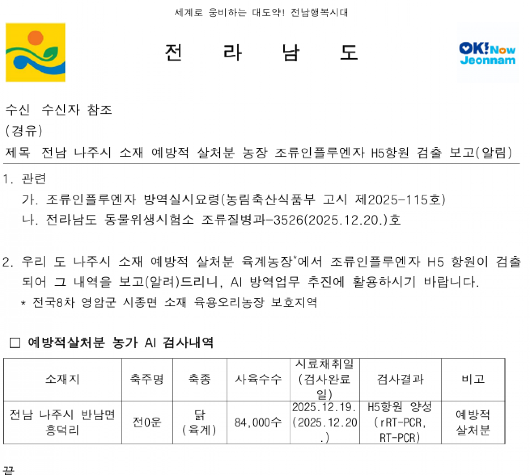 전북 남원 및 전남 나주 예방적 살처분 가금농장 고병원성 AI 의사환축 발생에 따른 방역강화 조치