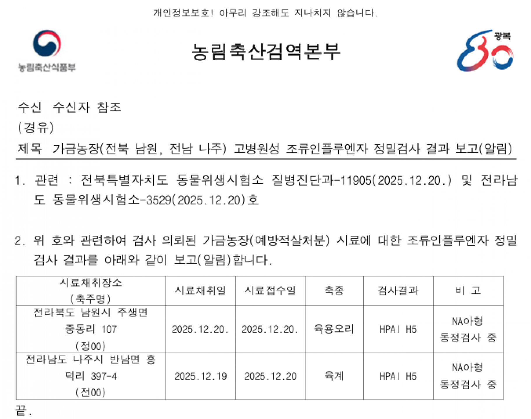 전북 남원(육용오리) 및 전남 나주(육계) 예방적 살처분 가금농장 고병원성 조류인플루엔자(AI) 확진에 따른 방역조치 알림