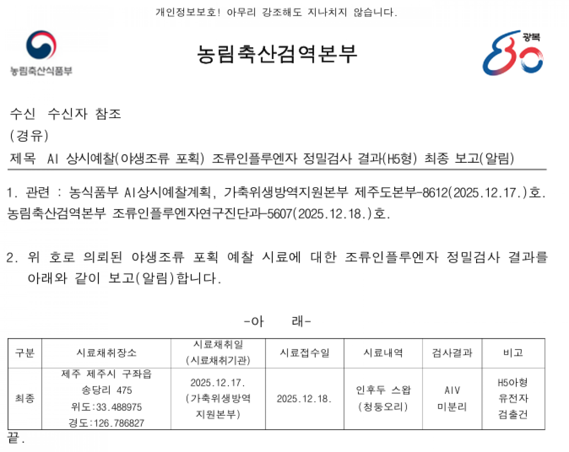 제주 소재 야생조류 AI 항원 미분리 지점 관리에 대한 후속조치 알림