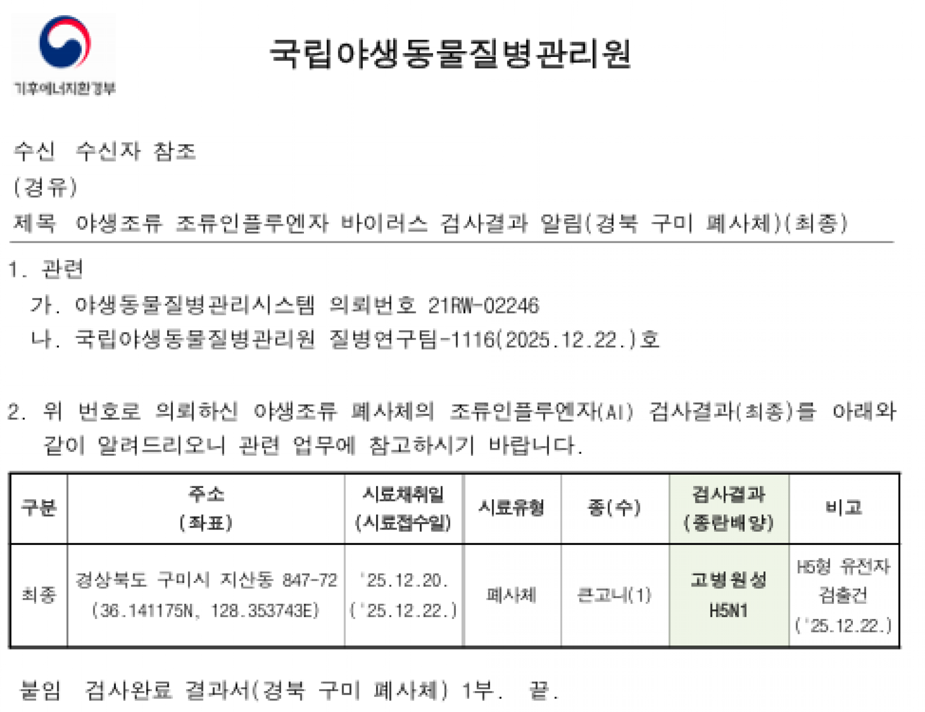 (경북 구미)야생조류 고병원성 조류인플루엔자(H5N1형) 검출에 따른 차단방역 강화 알림