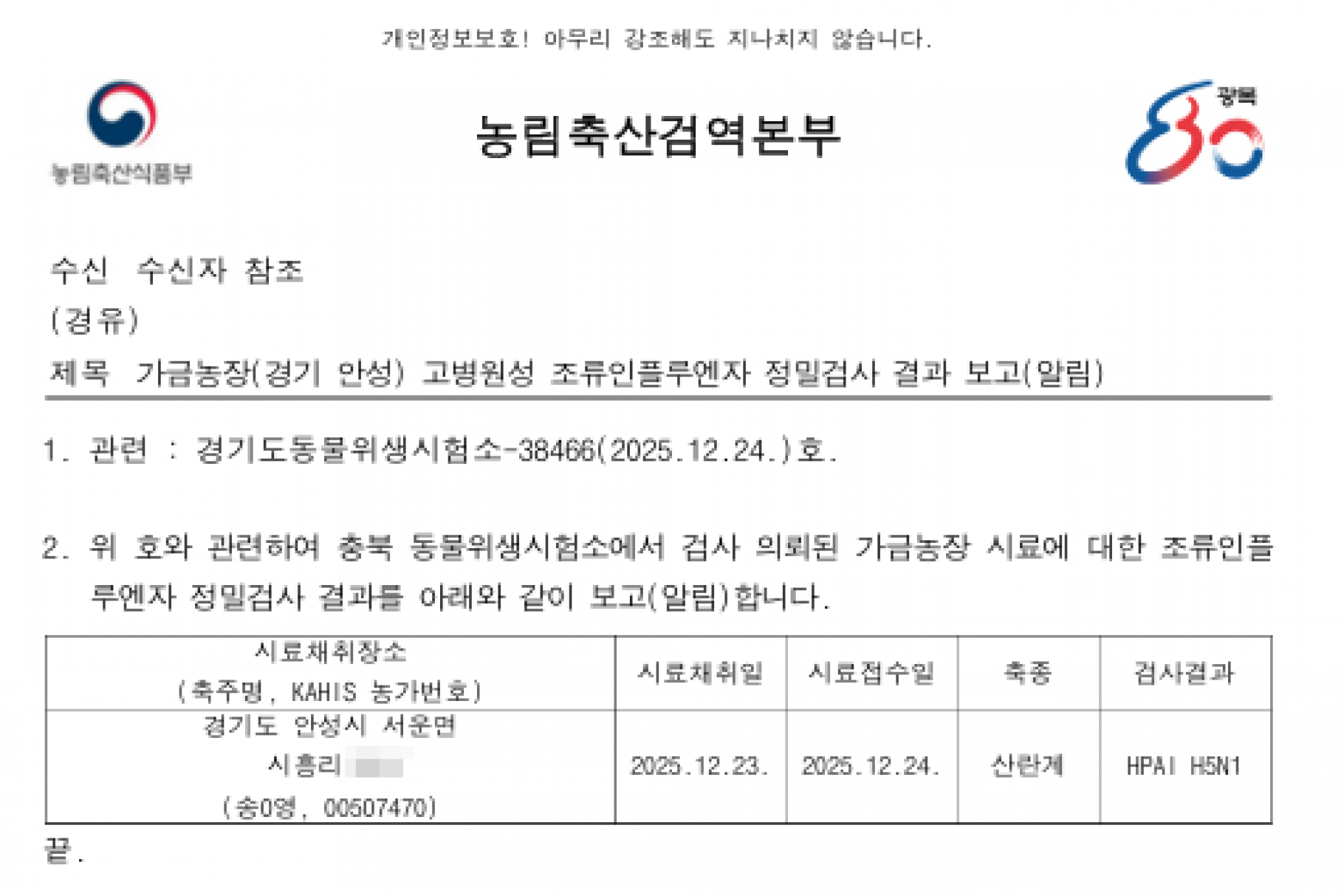 경기 안성(산란계) 및 전북 고창(육용오리) 가금농장 고병원성 조류인플루엔자(AI) 확진에 따른 방역조치 알림