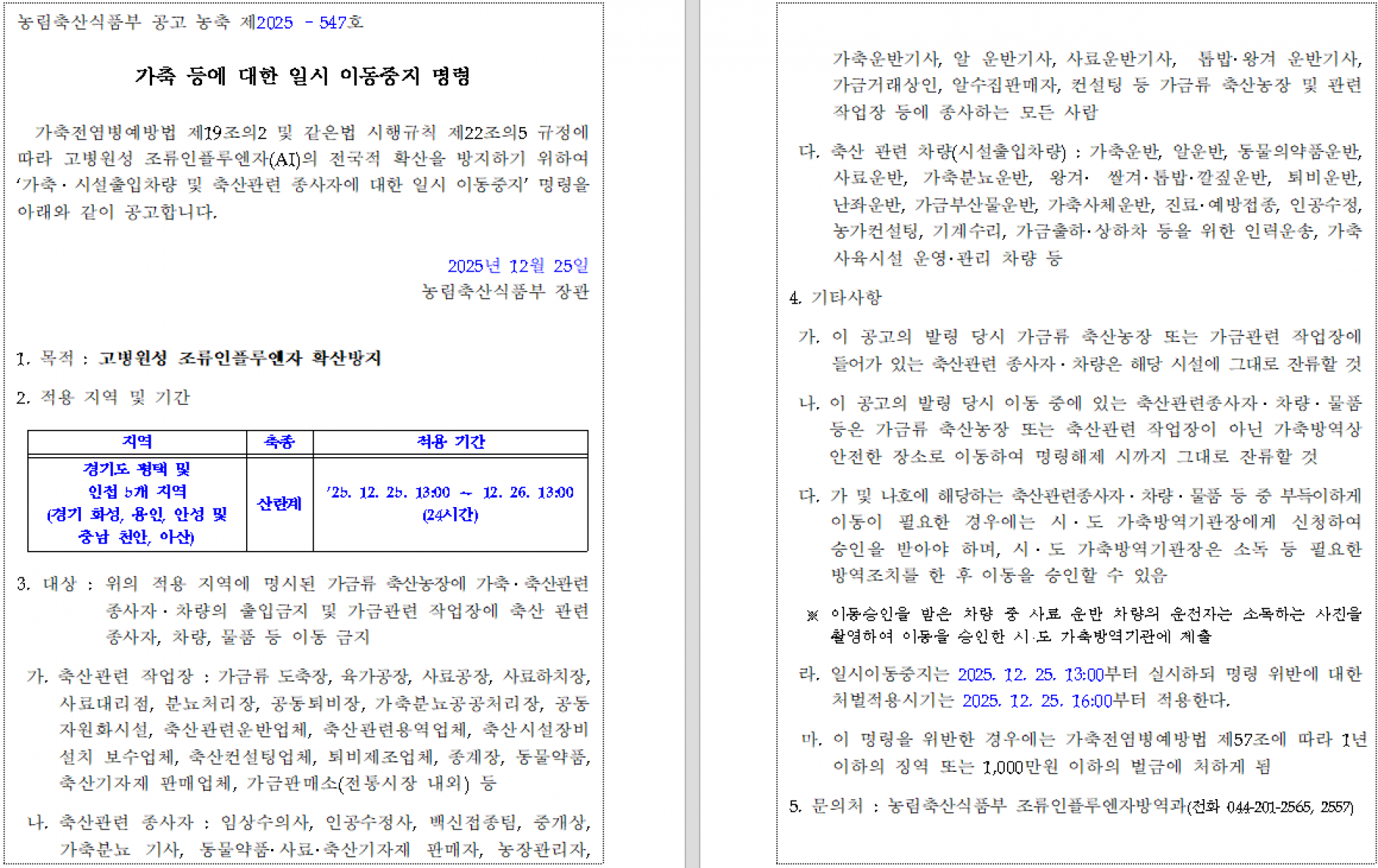 가축(산란계) 등에 대한 일시 이동중지(Standstill) 명령 발령 알림