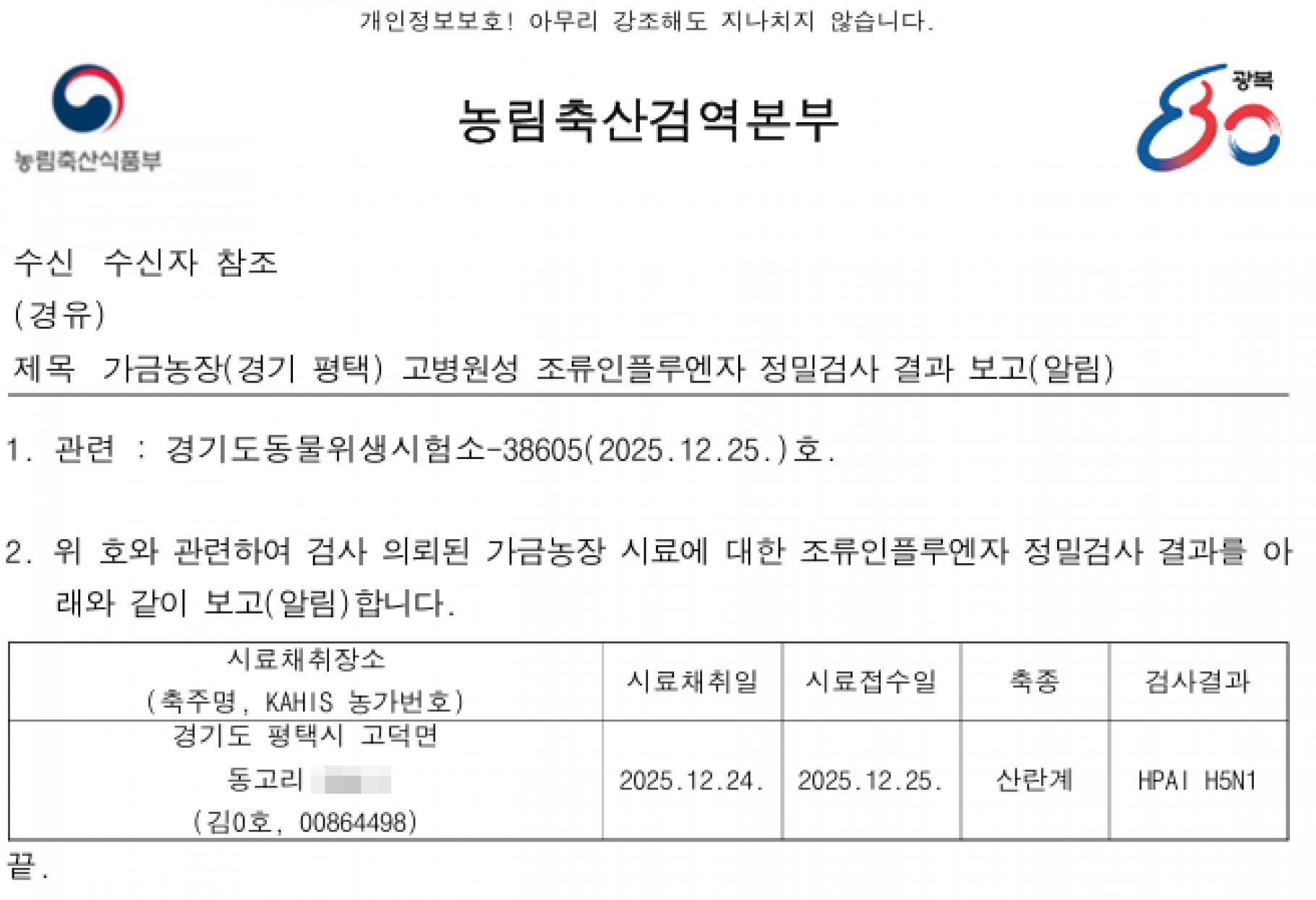 경기 평택 가금농장(산란계) 고병원성 조류인플루엔자(AI) 확진에 따른 방역조치 알림