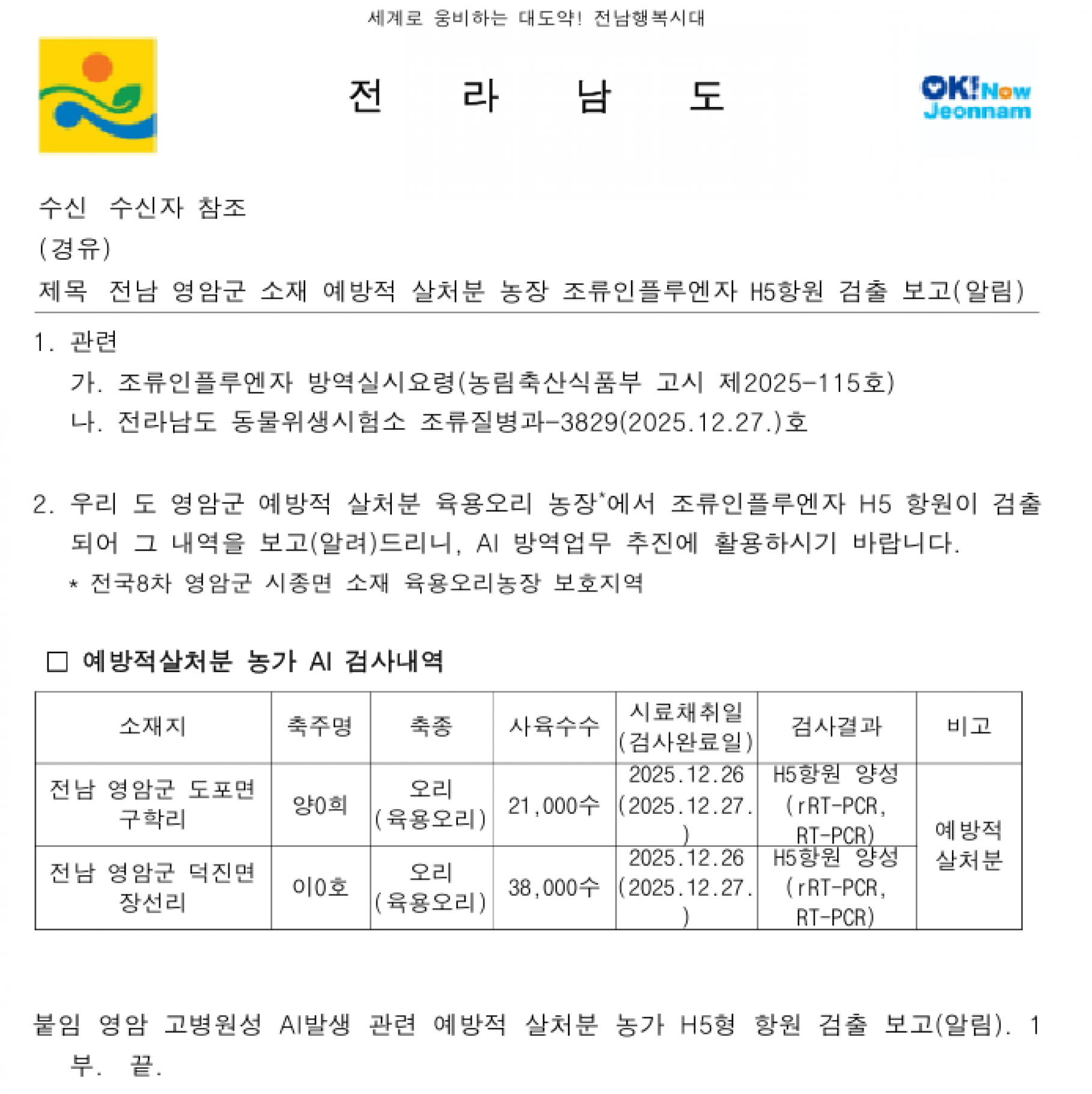 전남 영암 예방적 살처분 가금농장(육용오리) 고병원성 AI 의사환축 발생에 따른 방역강화 조치