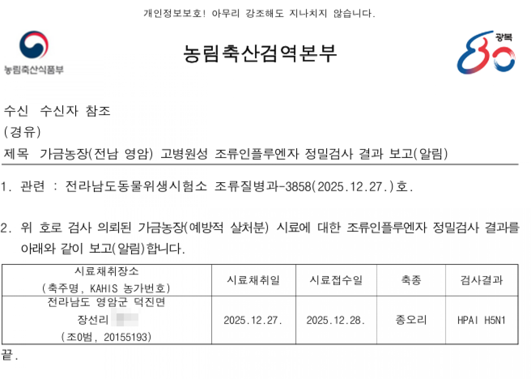 전남 영암 예방적 살처분 가금농장(종오리) 고병원성 조류인플루엔자(AI) 확진에 따른 방역조치 알림
