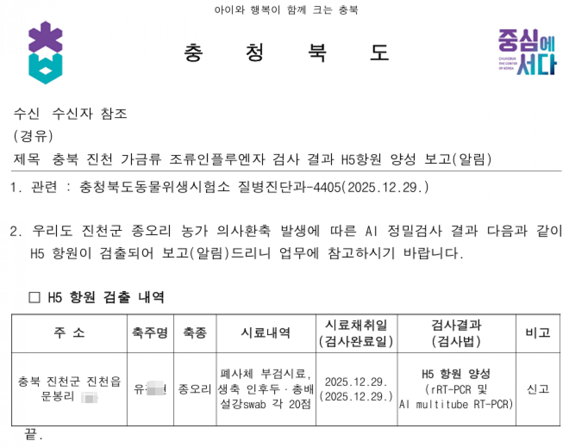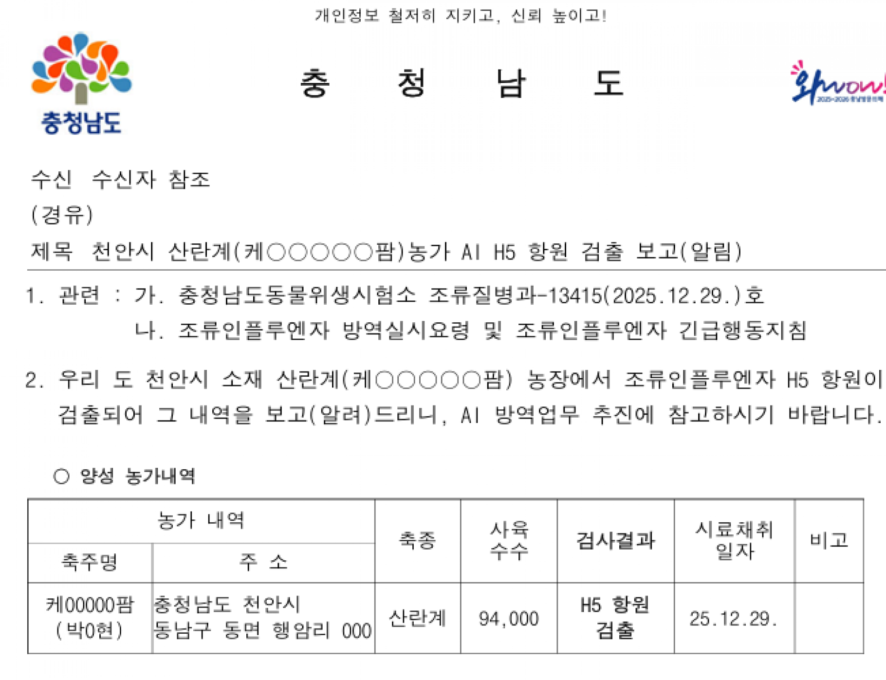충남 천안(산란계) 및 충북 진천(종오리) 가금농장 고병원성 AI 의사환축 발생에 따른 방역강화 조치