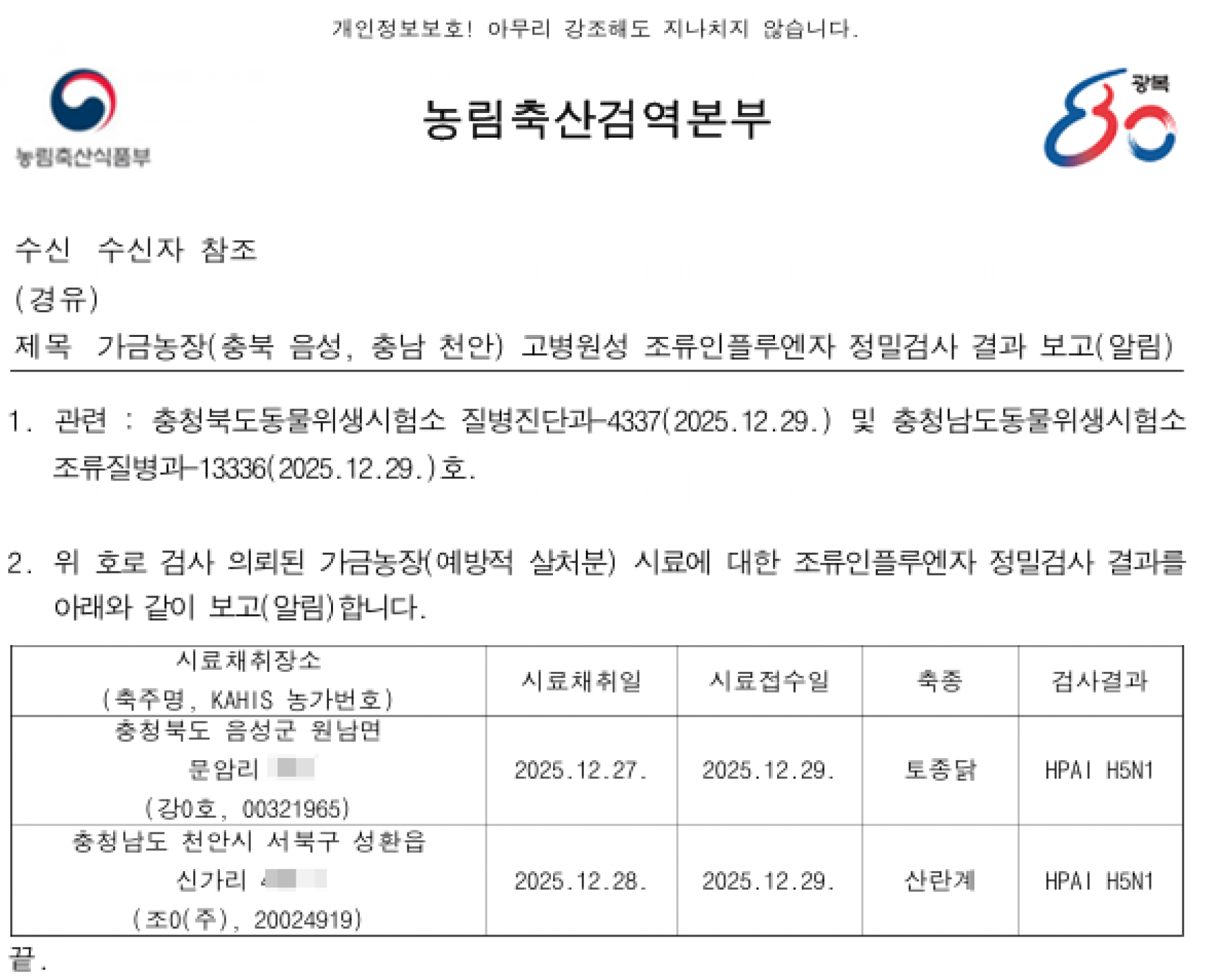 충북 음성(토종닭) 및 충남 천안(산란계) 예방적 살처분 가금농장 고병원성 조류인플루엔자(AI) 확진에 따른 방역조치 알림