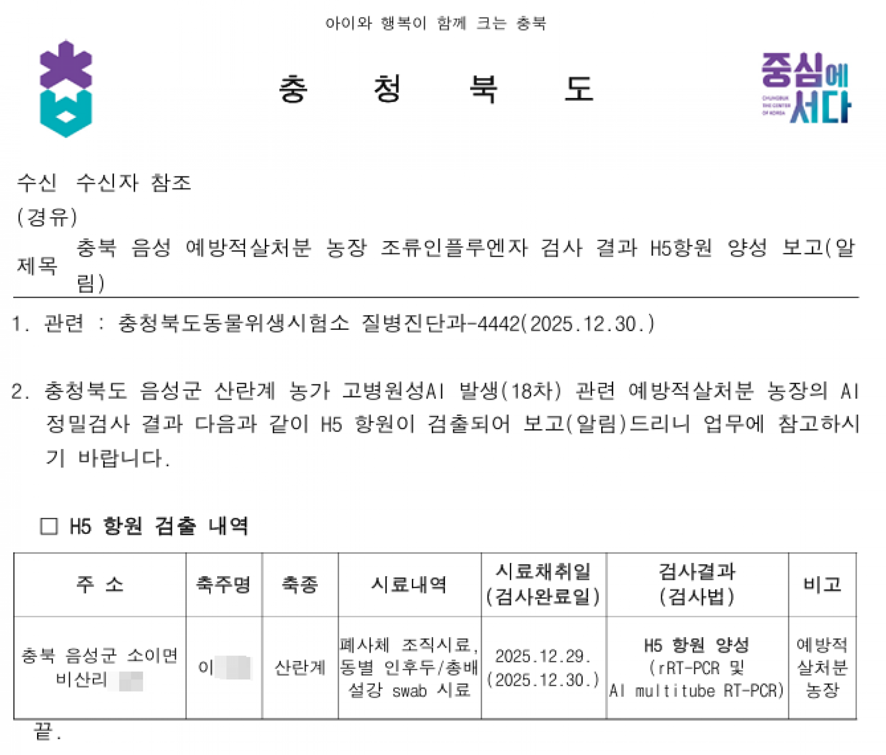 충북 음성 예방적 살처분 가금농장(산란계) 고병원성 AI 의사환축 발생에 따른 방역강화 조치