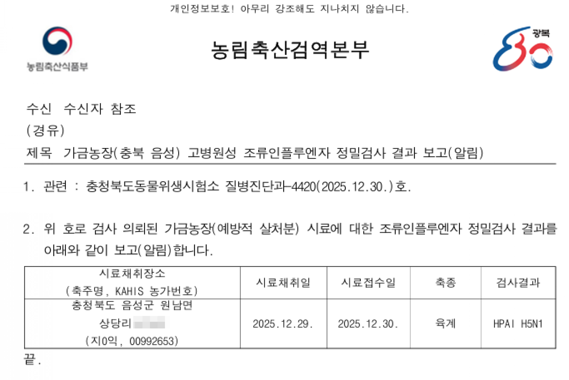 충북 음성 예방적 살처분 가금농장(육계) 고병원성 조류인플루엔자(AI) 확진에 따른 방역조치 알림