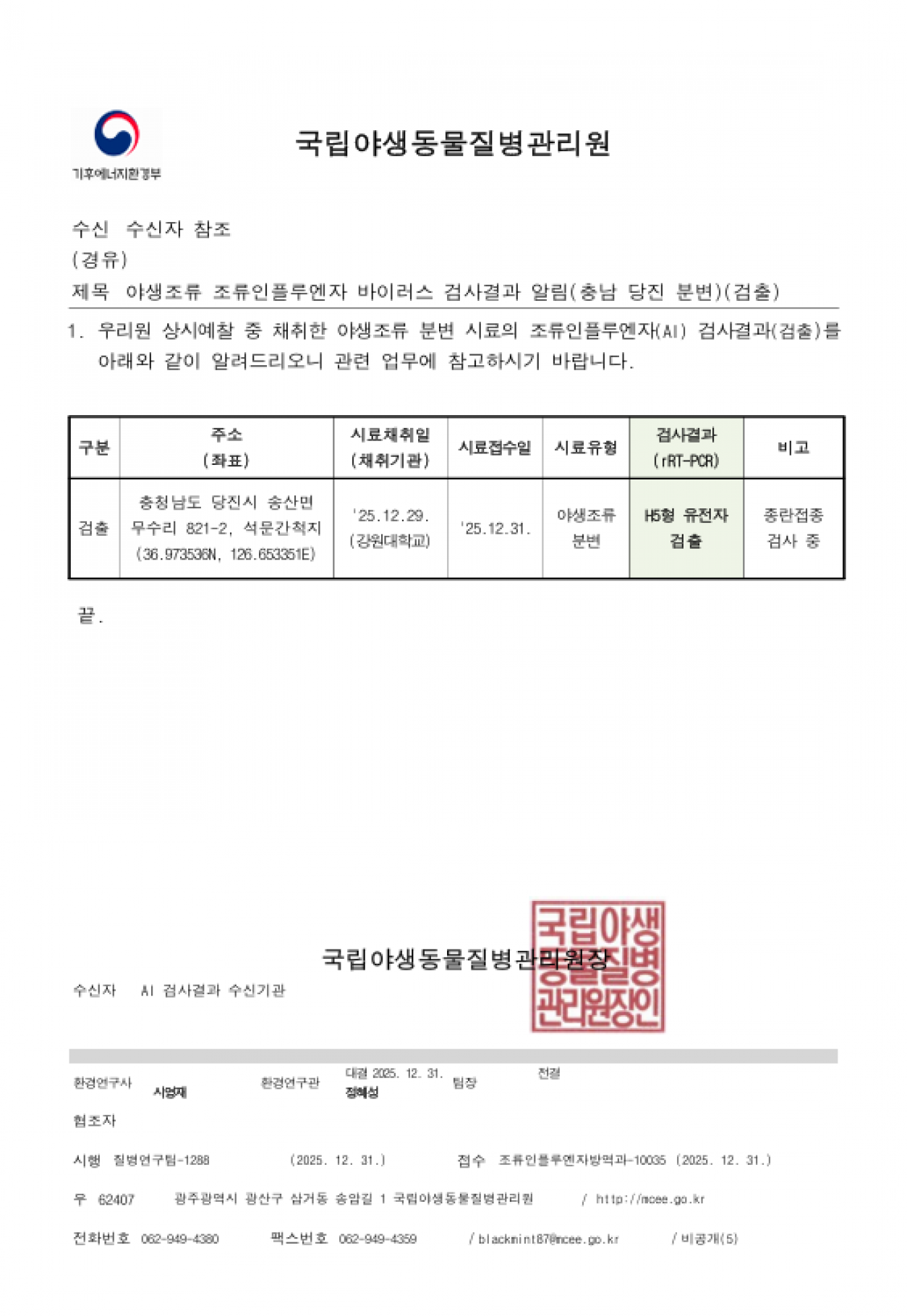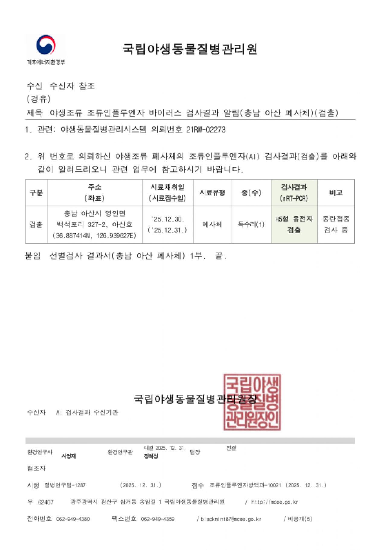 야생조류 조류인플루엔자(H5) 항원 검출에 따른 차단방역 및 예찰 강화 알림