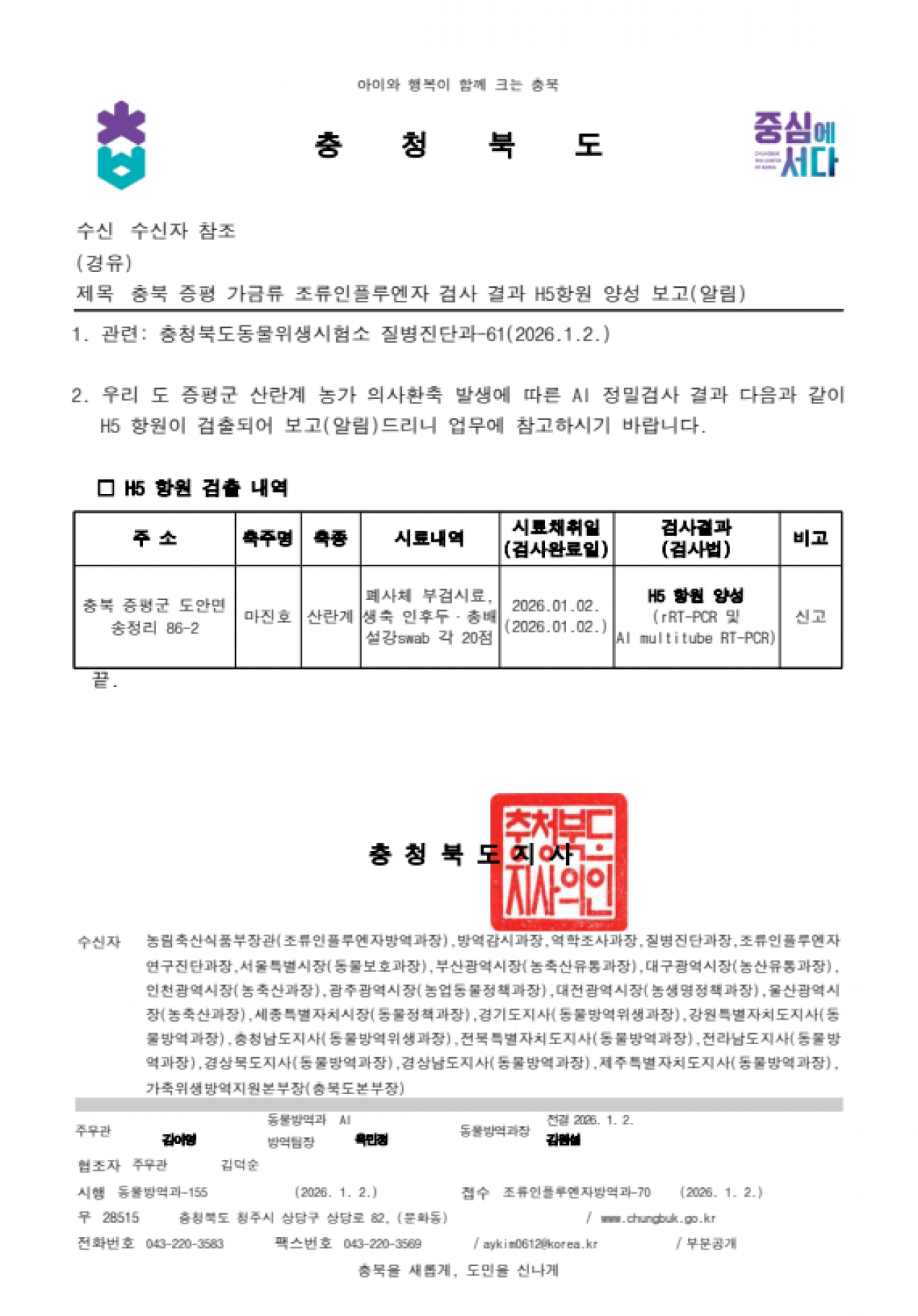 충북 증평(산란계) 가금농장 고병원성 AI 의사환축 발생에 따른 방역강화 조치