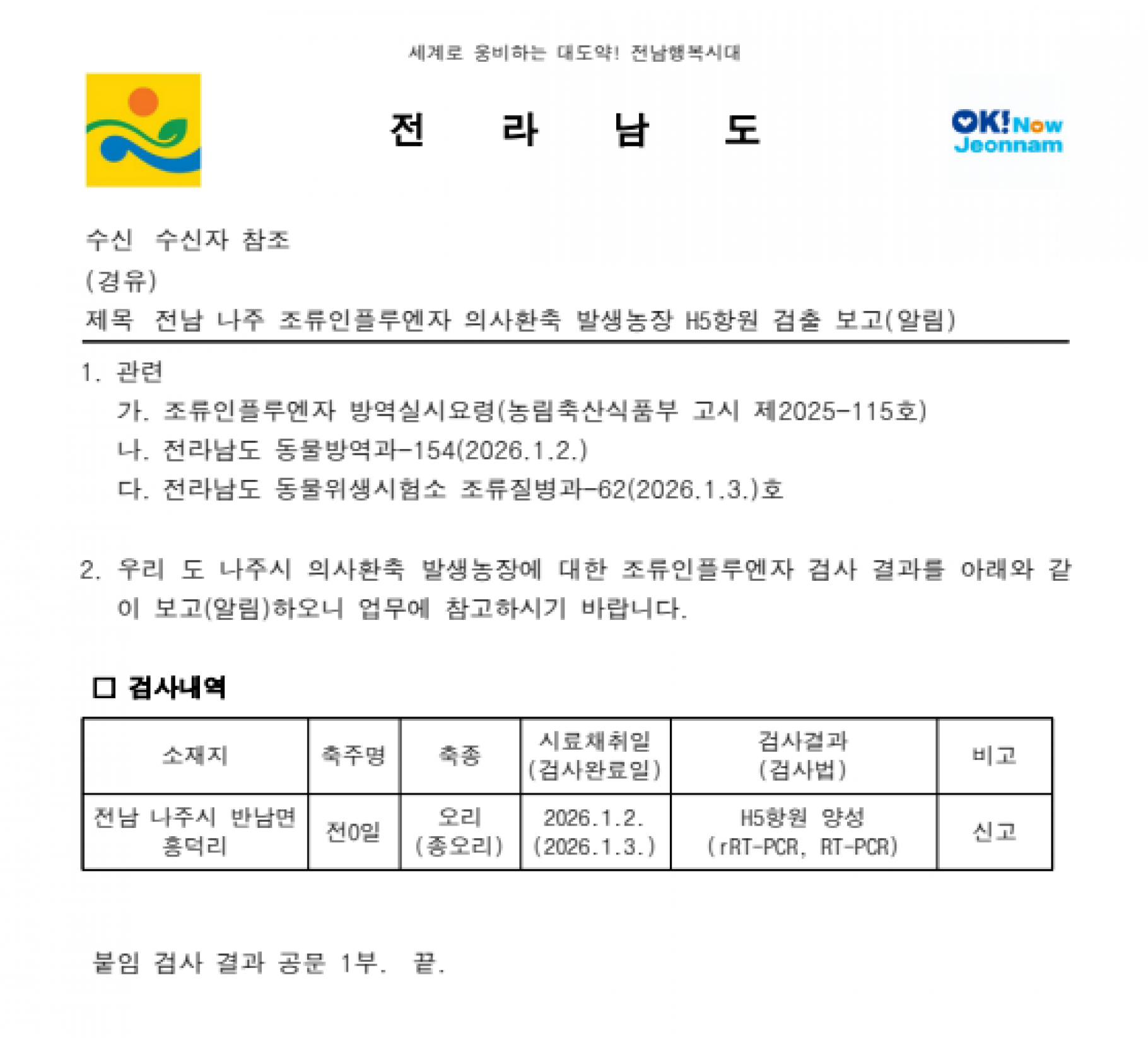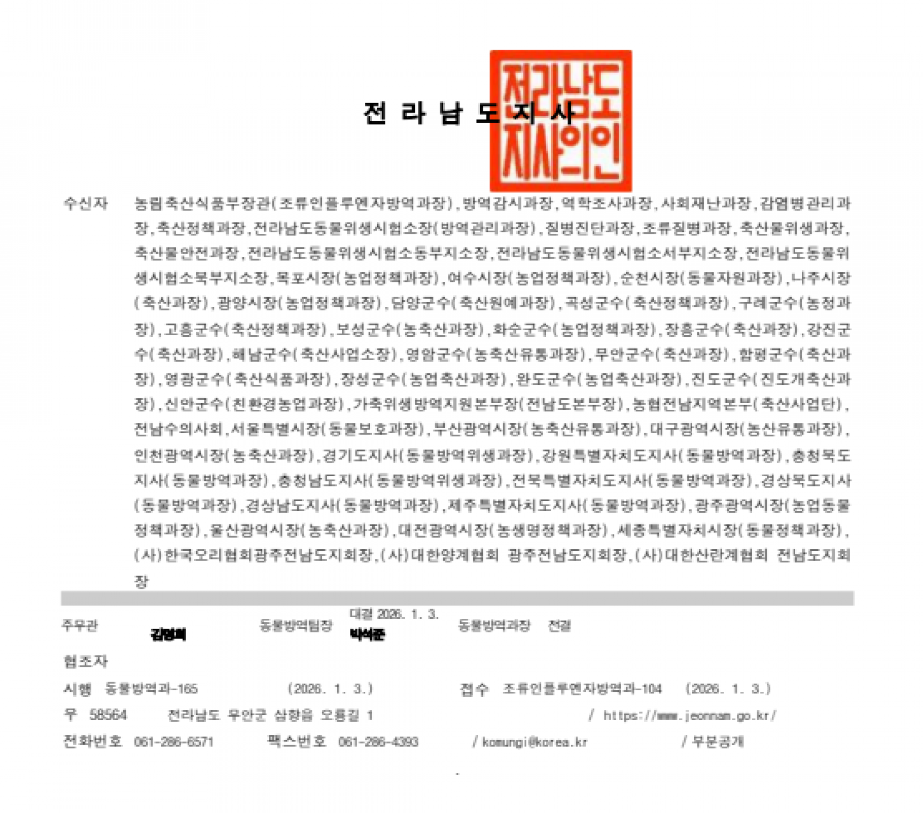 전남 나주(종오리) 가금농장 고병원성 AI 의사환축 발생에 따른 방역강화 조치