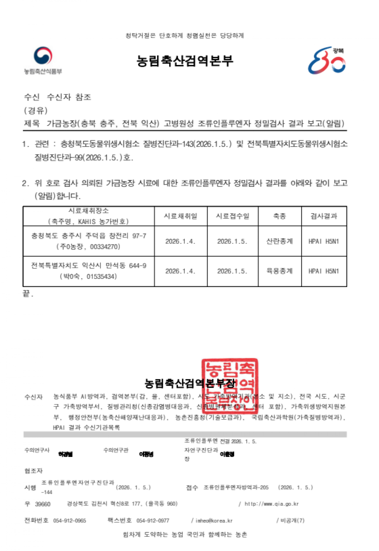충북 충주(산란종계) 및 전북 익산(육용종계) 가금농장 고병원성 조류인플루엔자(AI) 확진에 따른 방역조치 알림