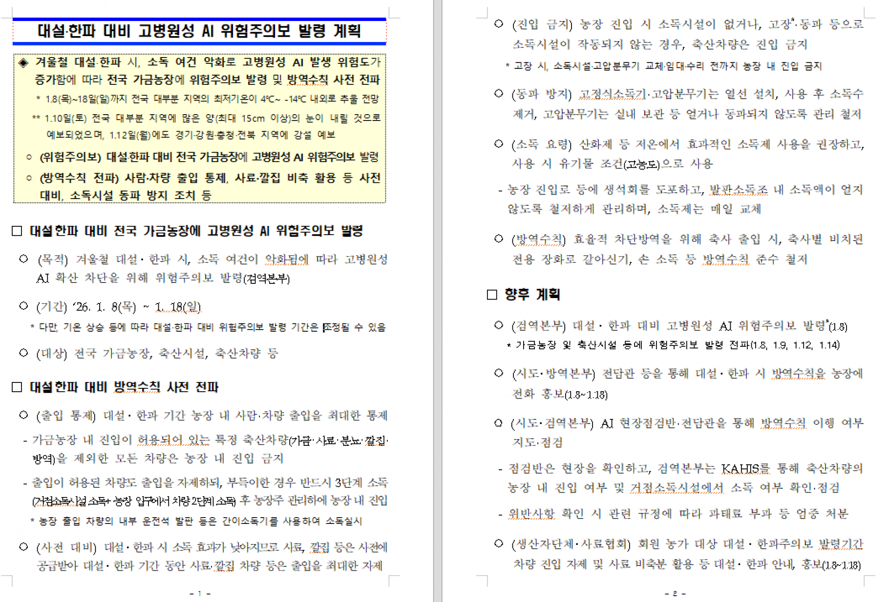 대설?한파 대비 고병원성 AI 위험주의보 발령 및 방역수칙 전파 알림