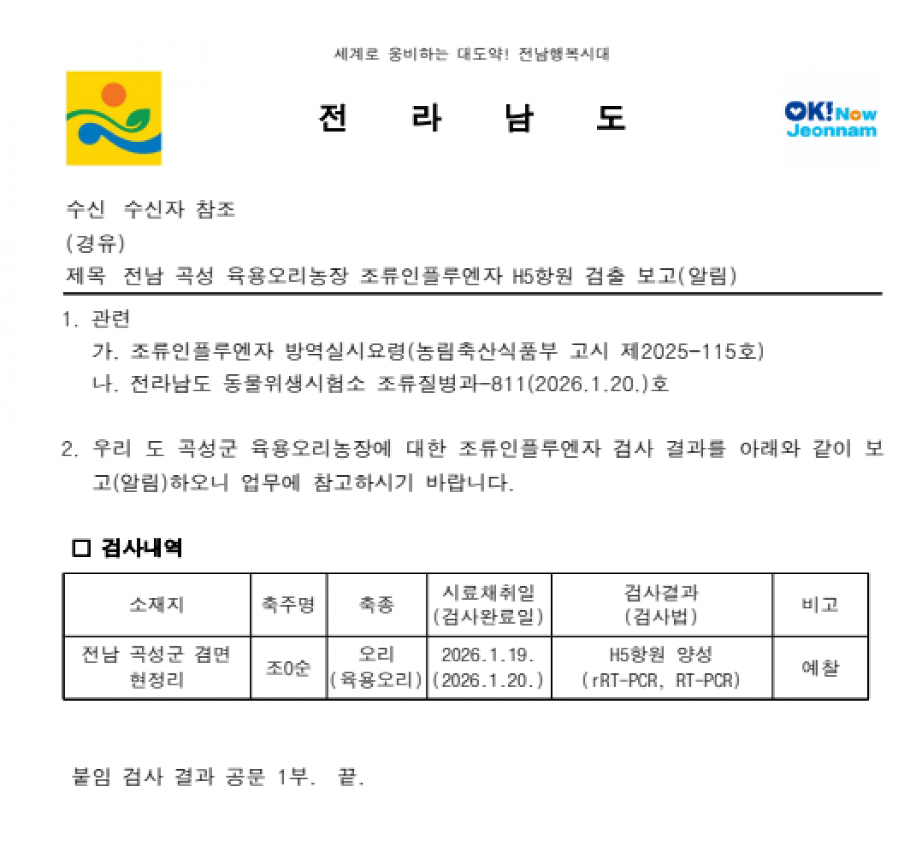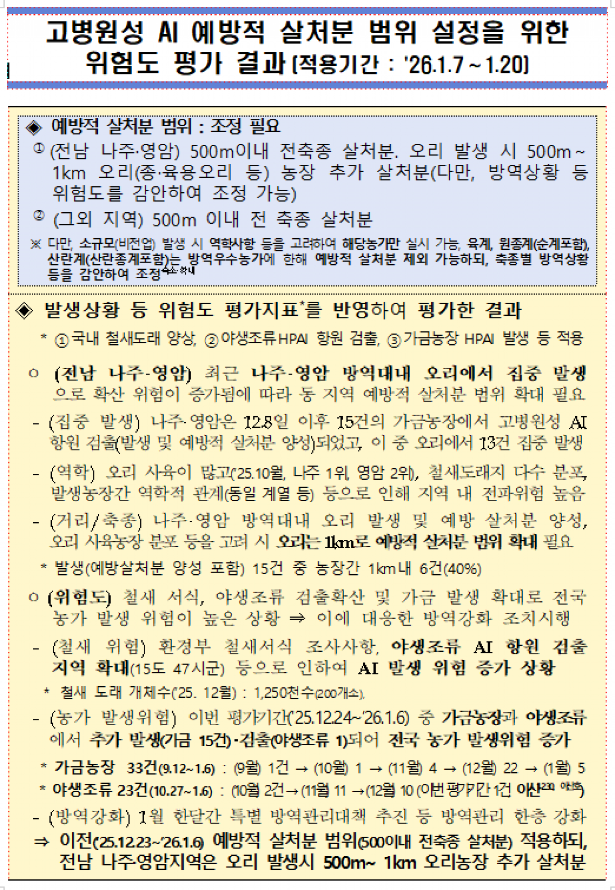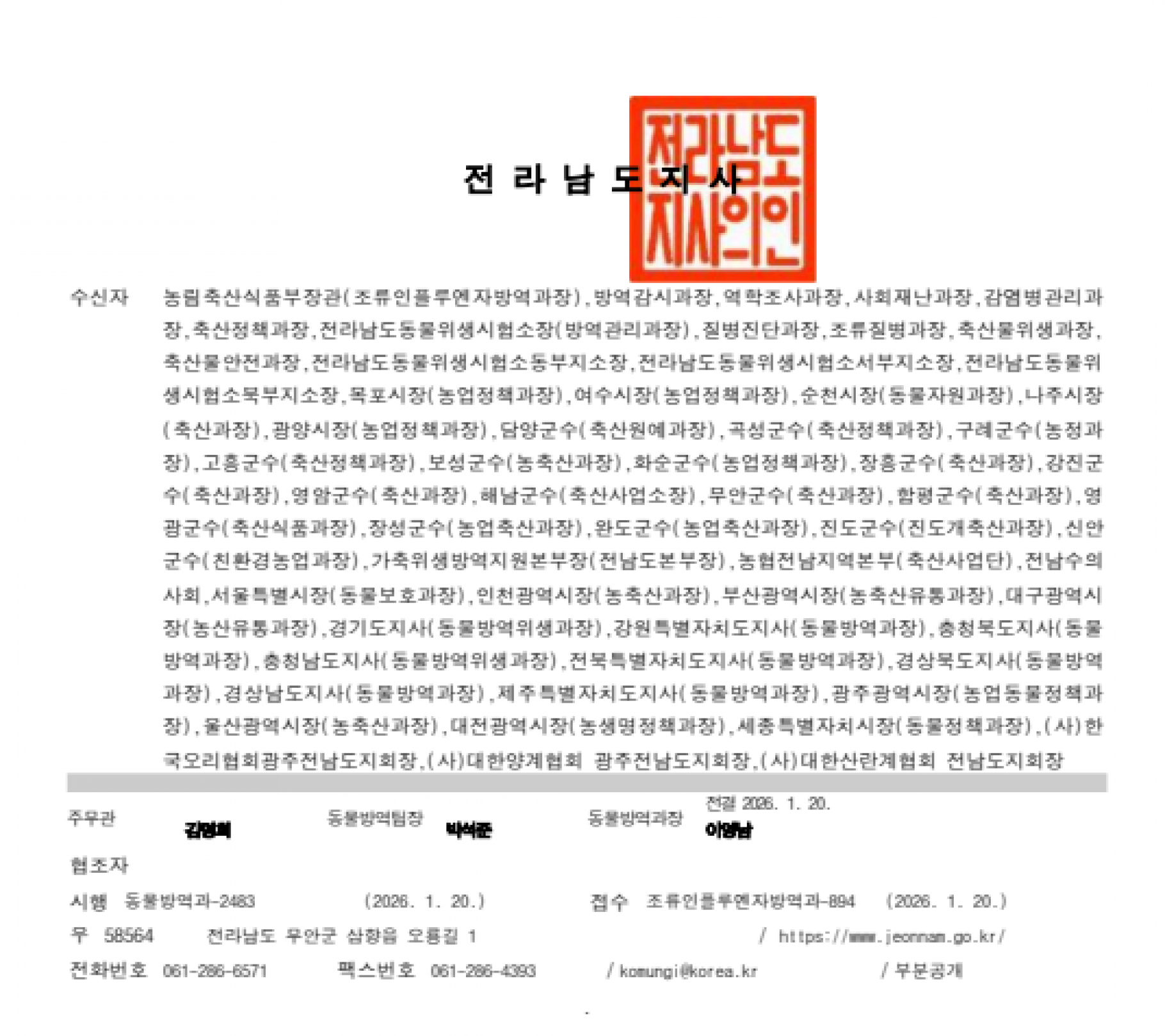 전남 곡성 가금농장(육용오리) 고병원성 AI 의사환축 발생에 따른 방역강화 조치