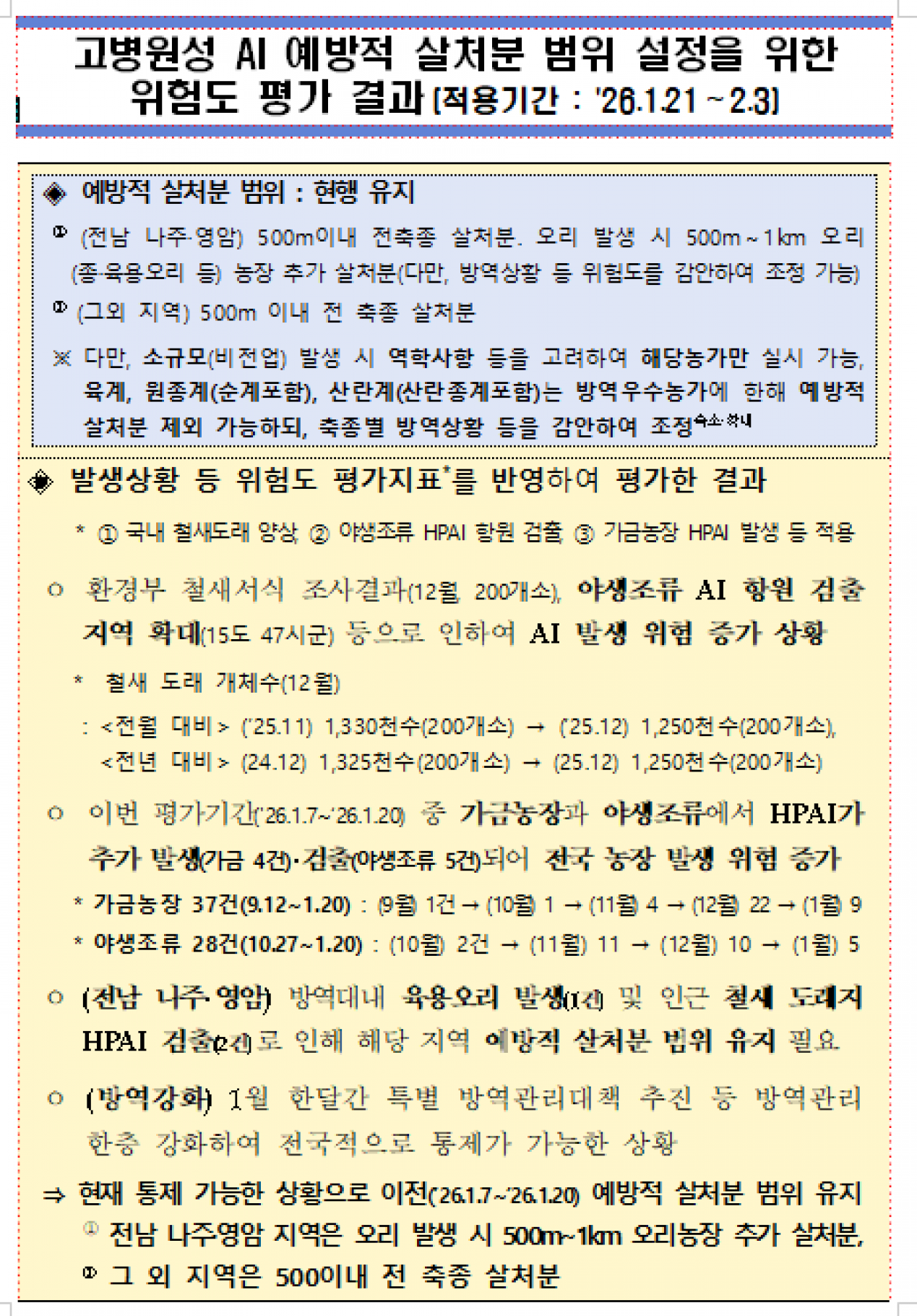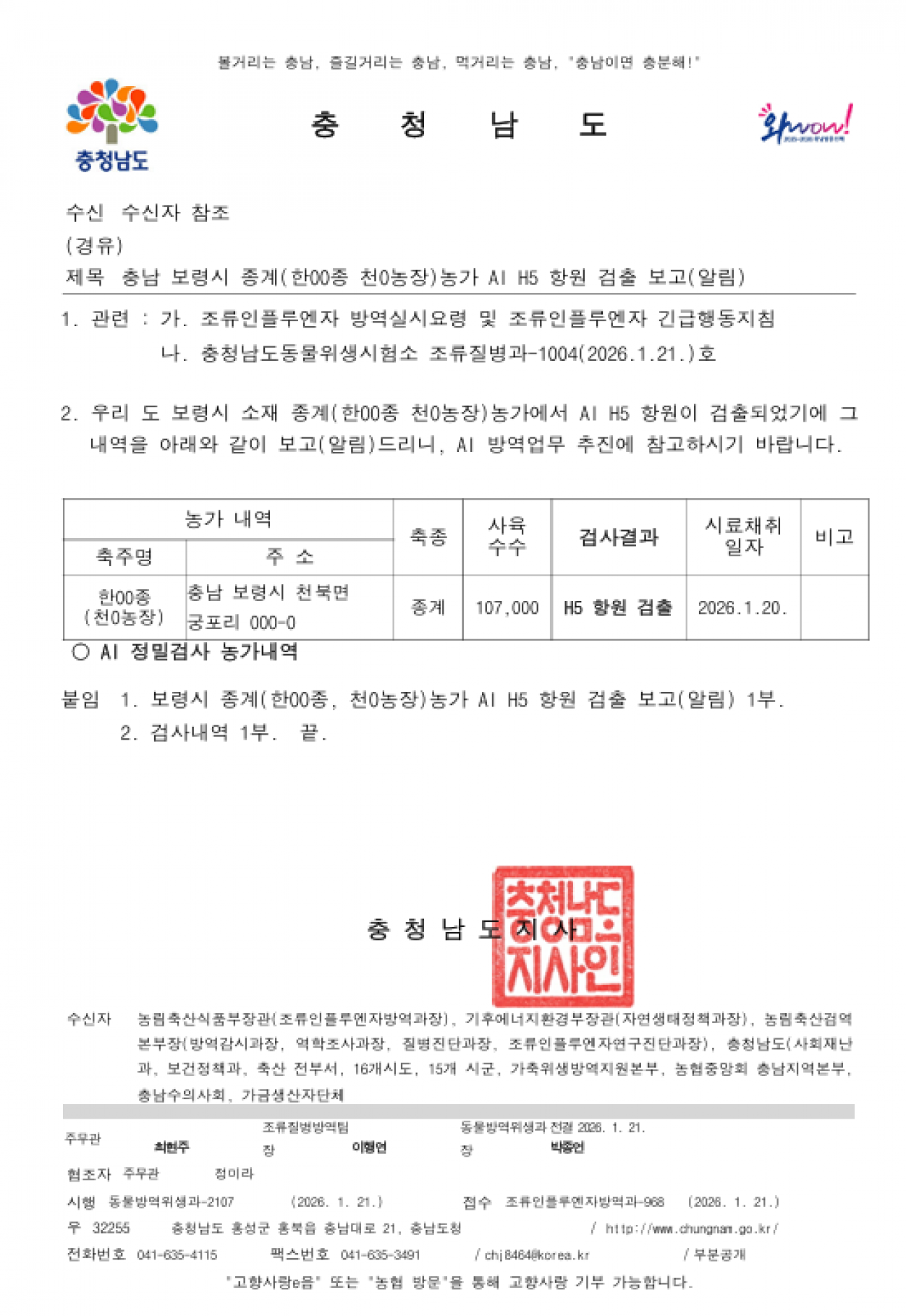 충남 보령 가금농장(육용종계) 고병원성 AI 의사환축 발생에 따른 방역강화 조치