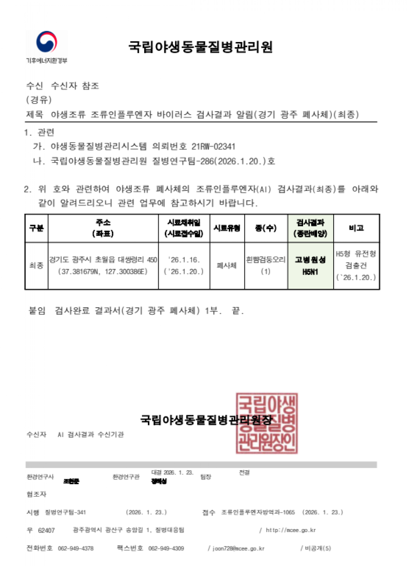 야생조류 고병원성 조류인플루엔자(H5N1형) 검출에 따른 차단방역 강화 알림