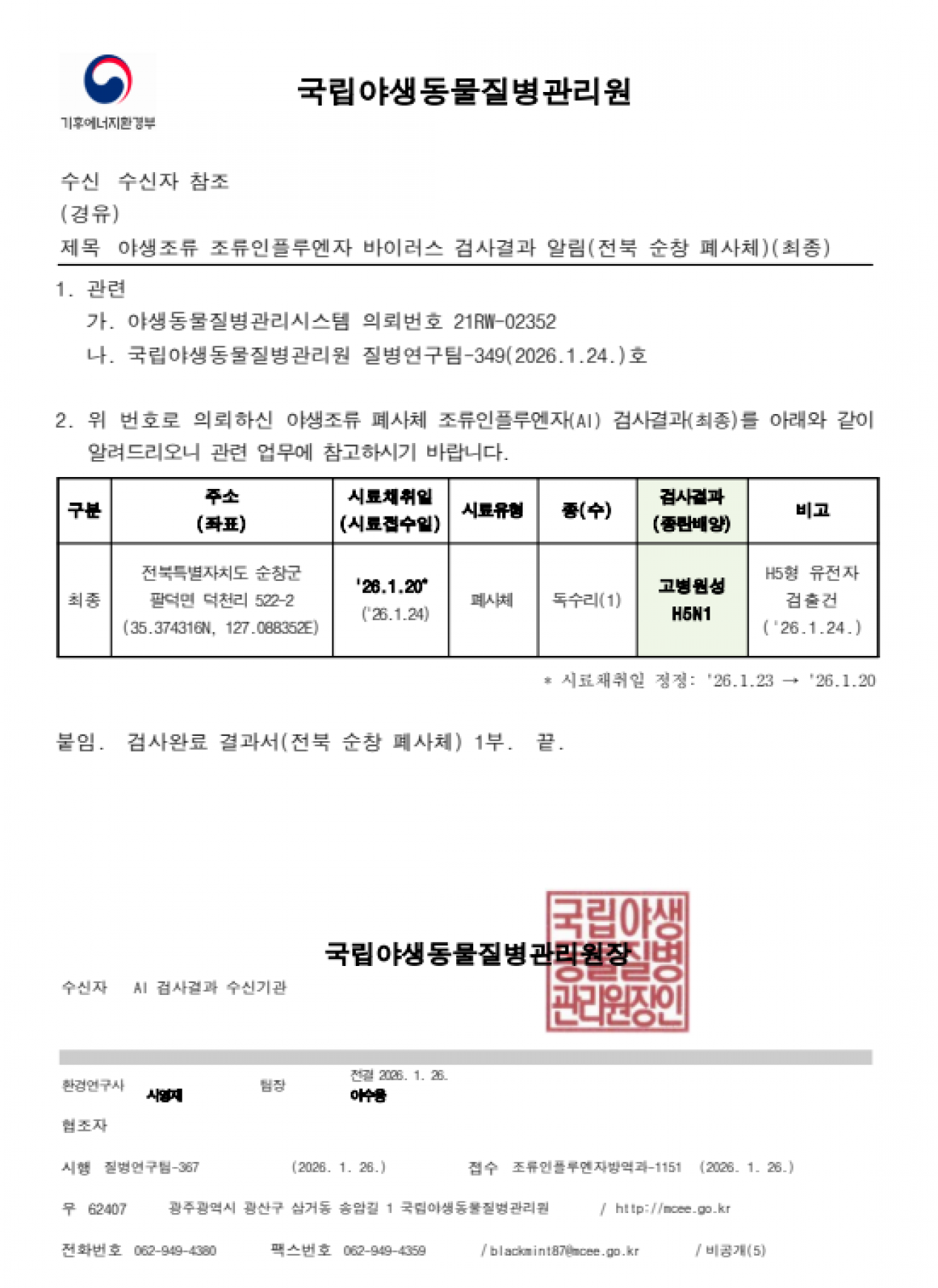야생조류 고병원성 조류인플루엔자(H5N1형) 검출에 따른 차단방역 강화 알림