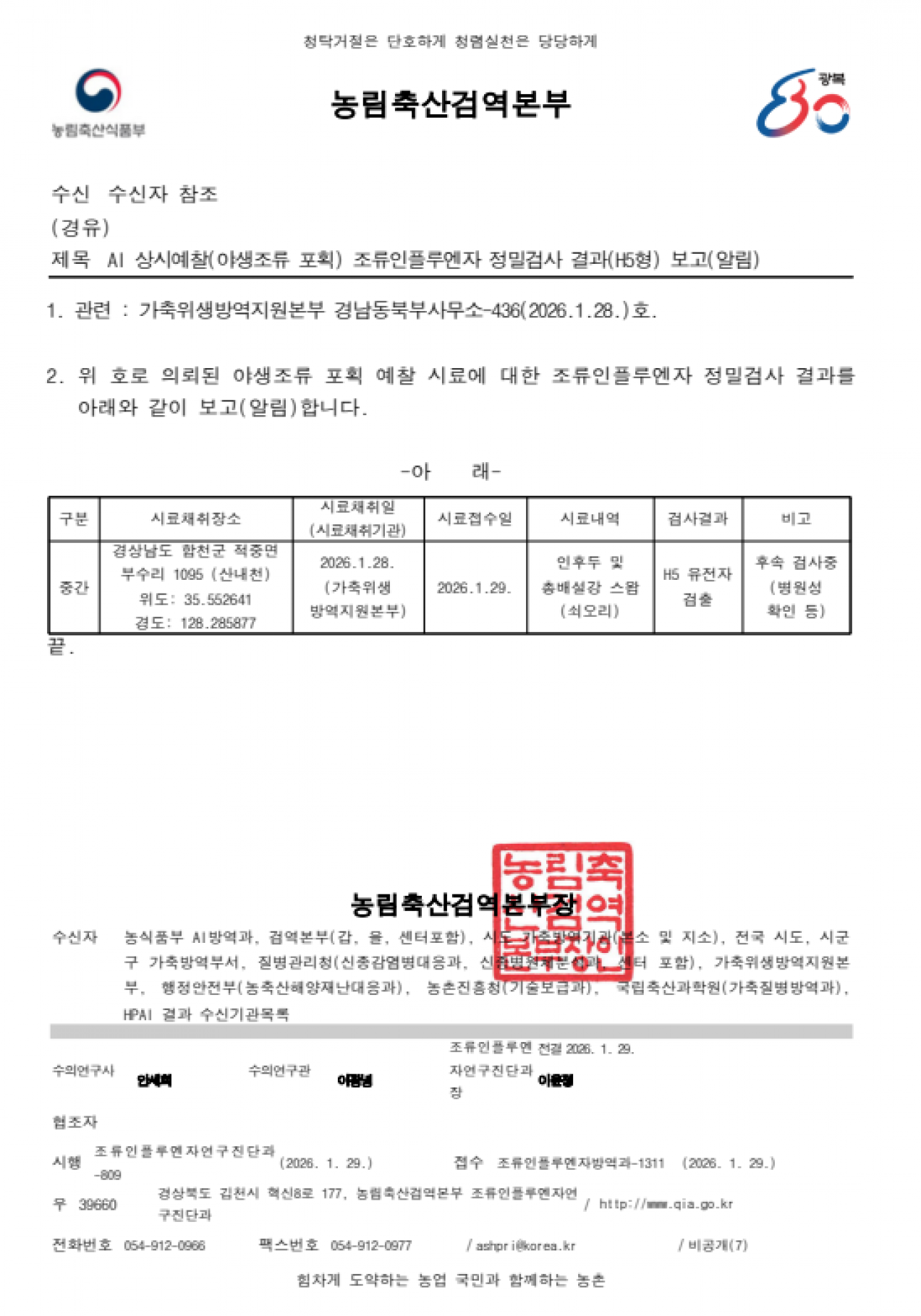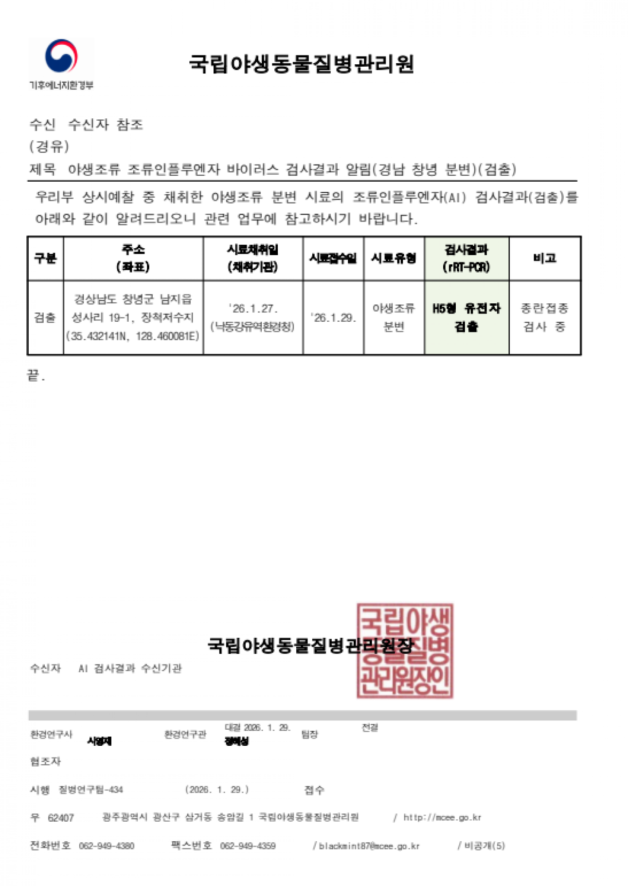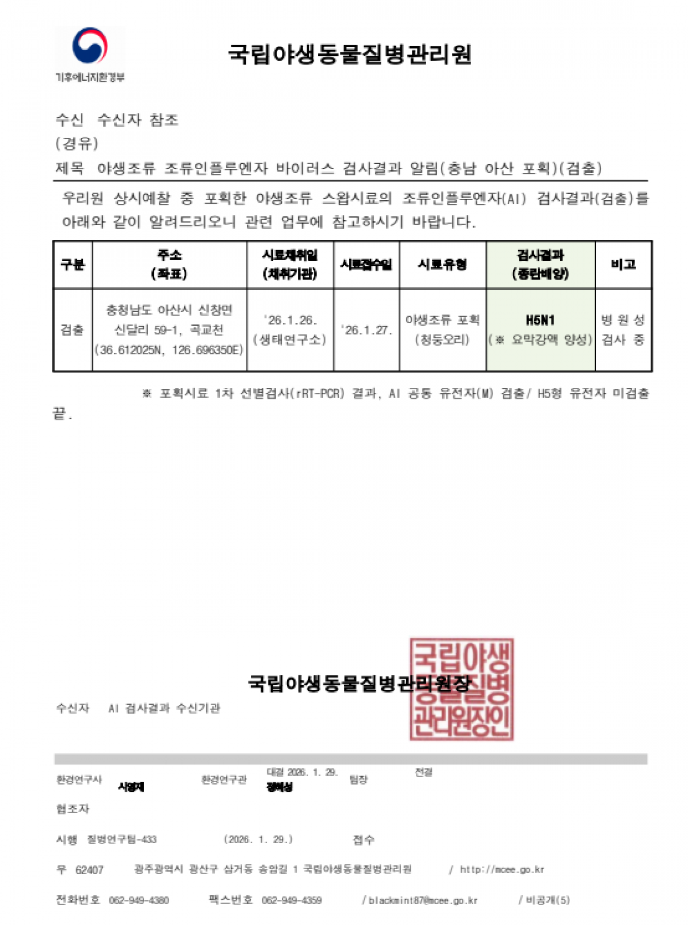 야생조류 조류인플루엔자(H5) 항원 검출에 따른 차단방역 및 예찰 강화 알림