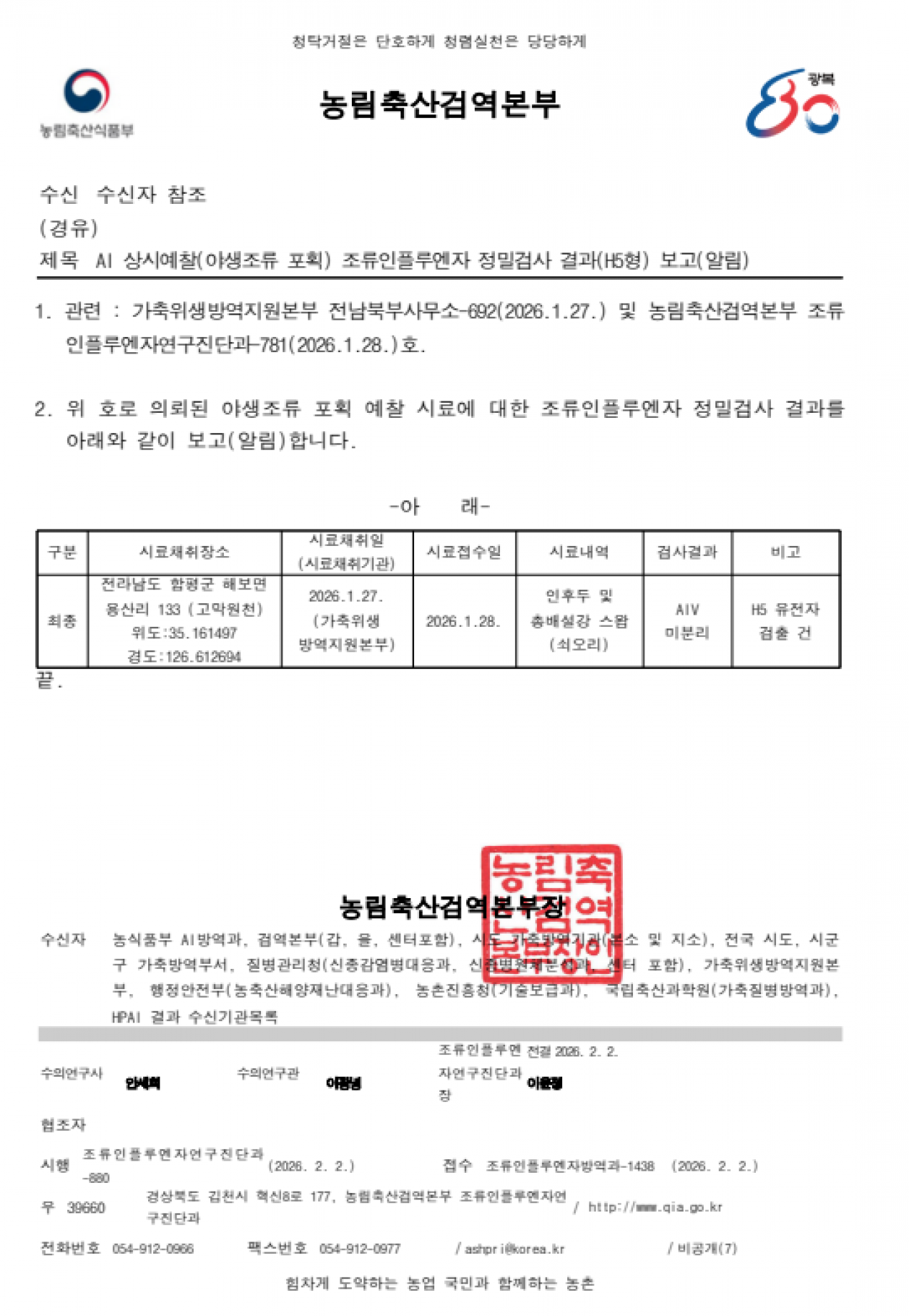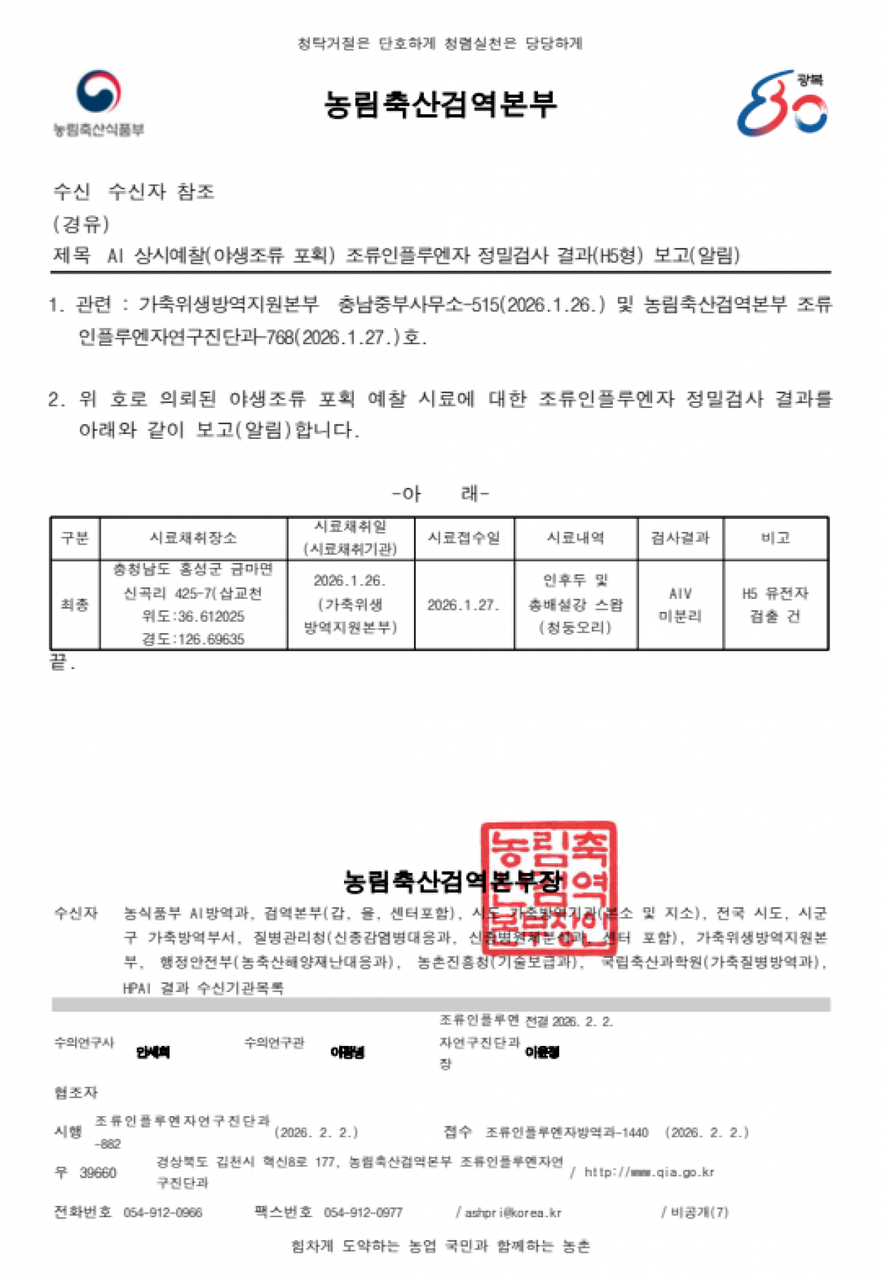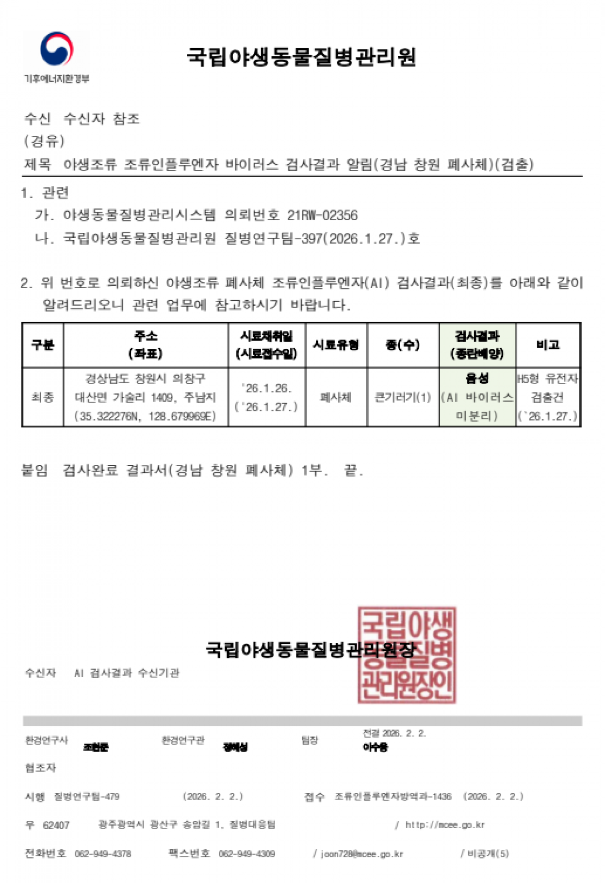 충남 홍성, 충남 아산, 충남 공주, 전남 담양, 전남 함평 및 경남 창원 소재 야생조류 AI 항원 미분리 지점 관리에 대한 후속조치 알림