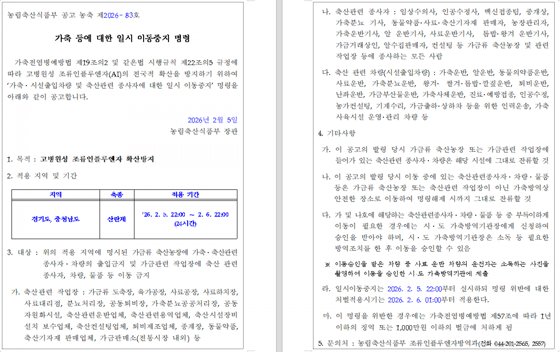 가축(산란계) 등에 대한 일시 이동중지(Standstill) 명령 발령 알림