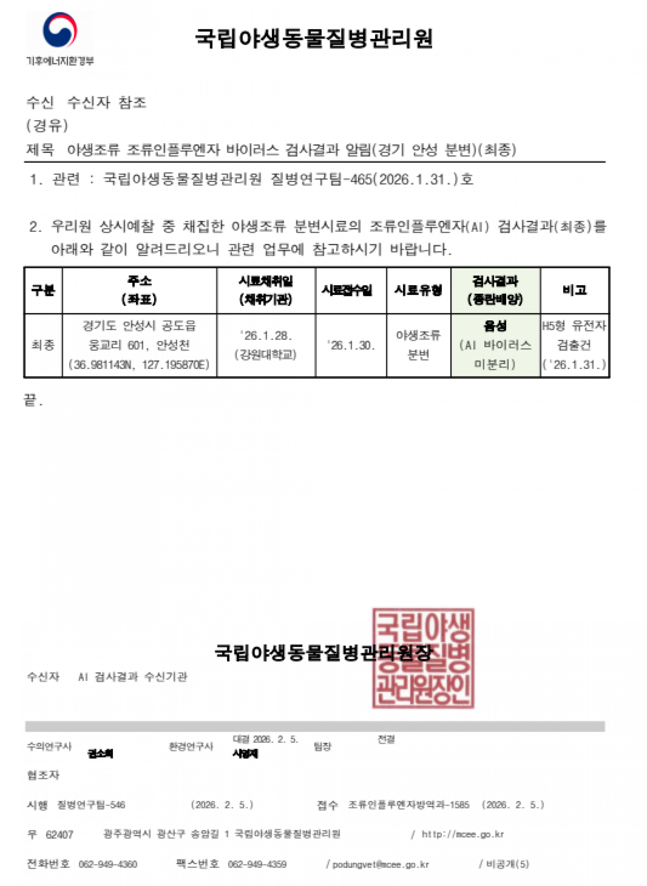 경기 안성 소재 야생조류 AI 항원 미분리 지점 관리에 대한 후속조치 알림