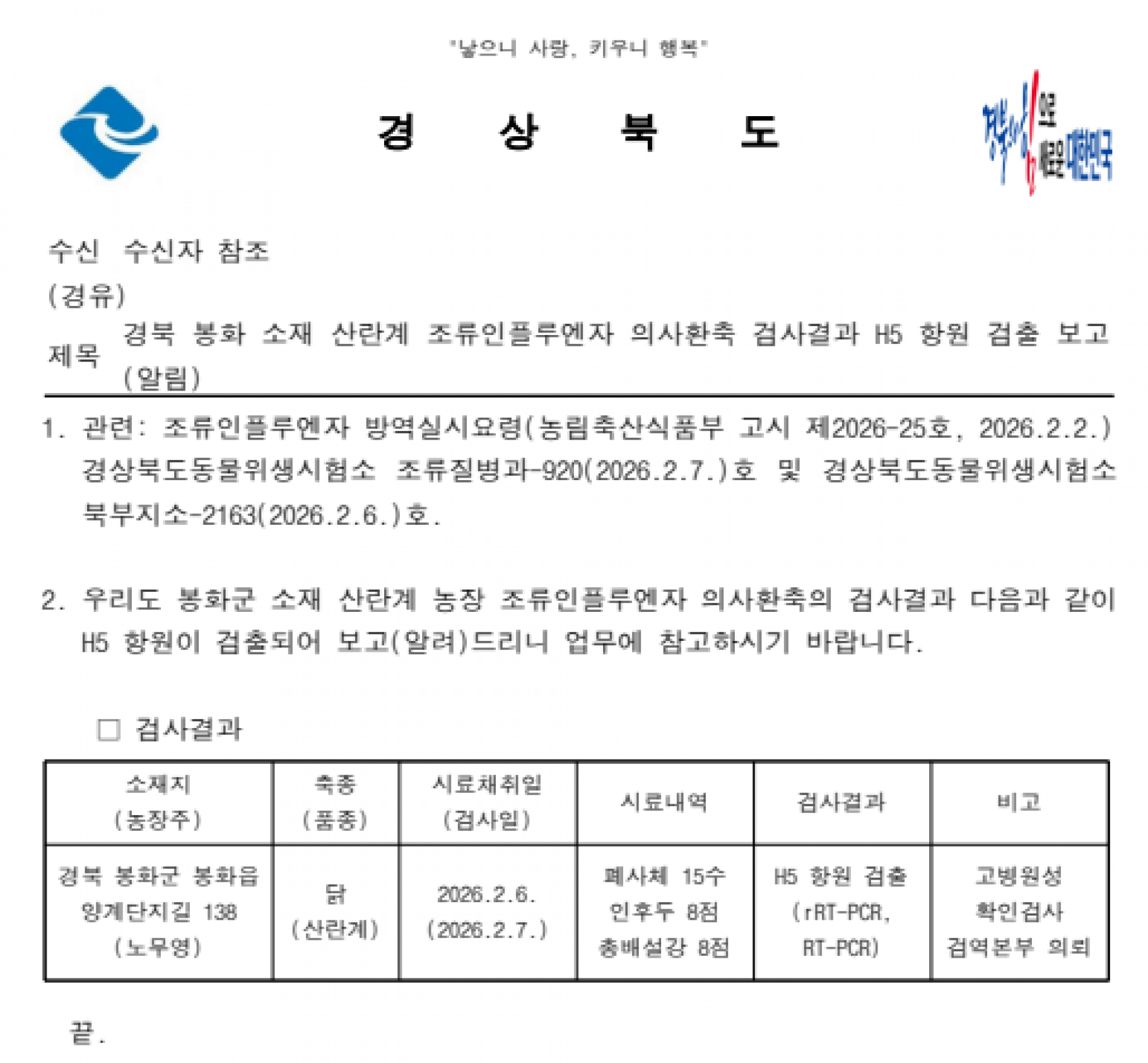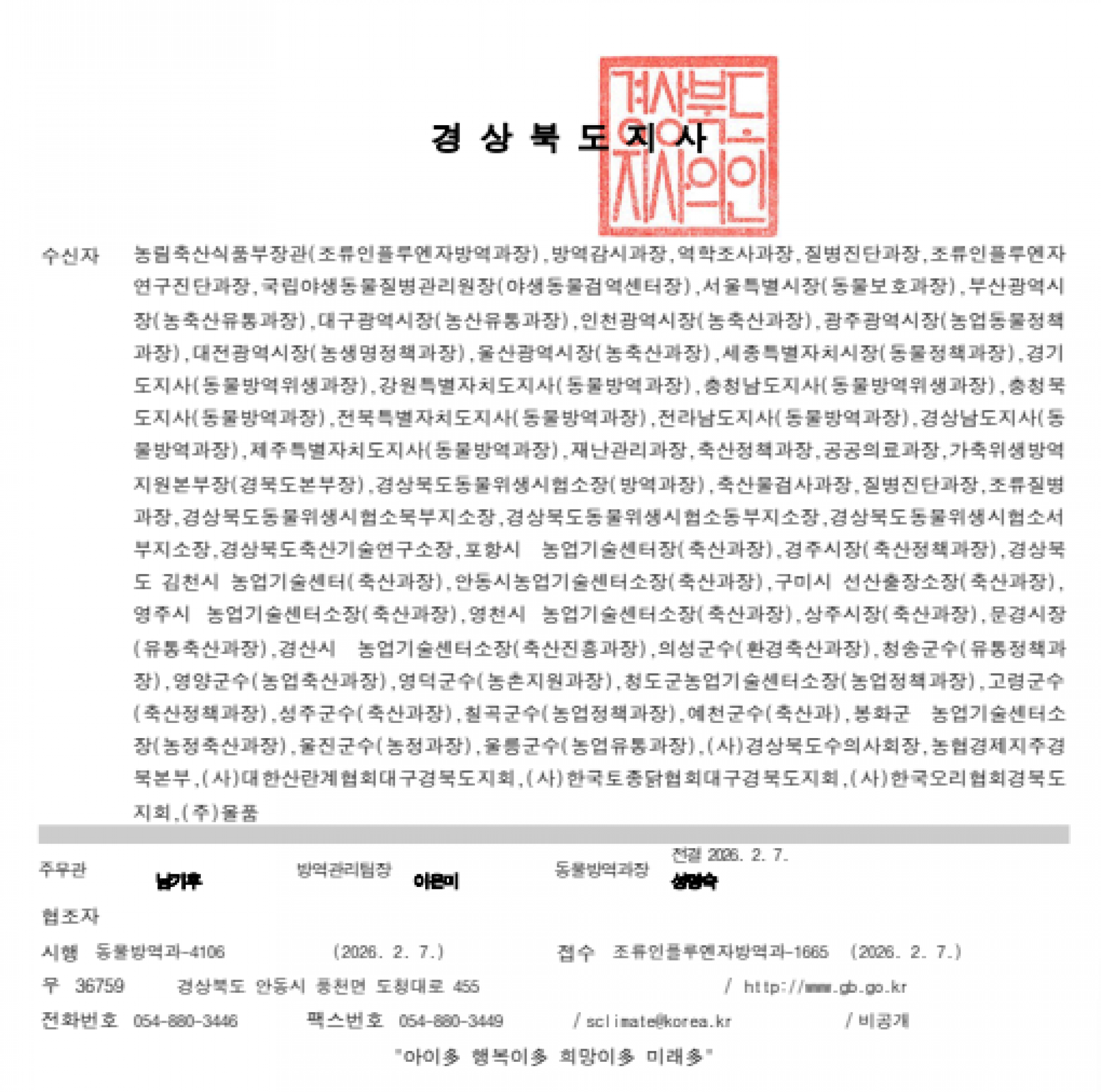 경북 봉화 가금농장(산란계) 고병원성 AI 의사환축 발생에 따른 방역강화 조치