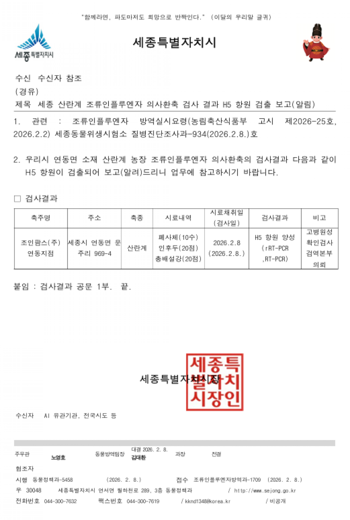세종 가금농장(산란계) 고병원성 AI 의사환축 발생에 따른 방역강화 조치