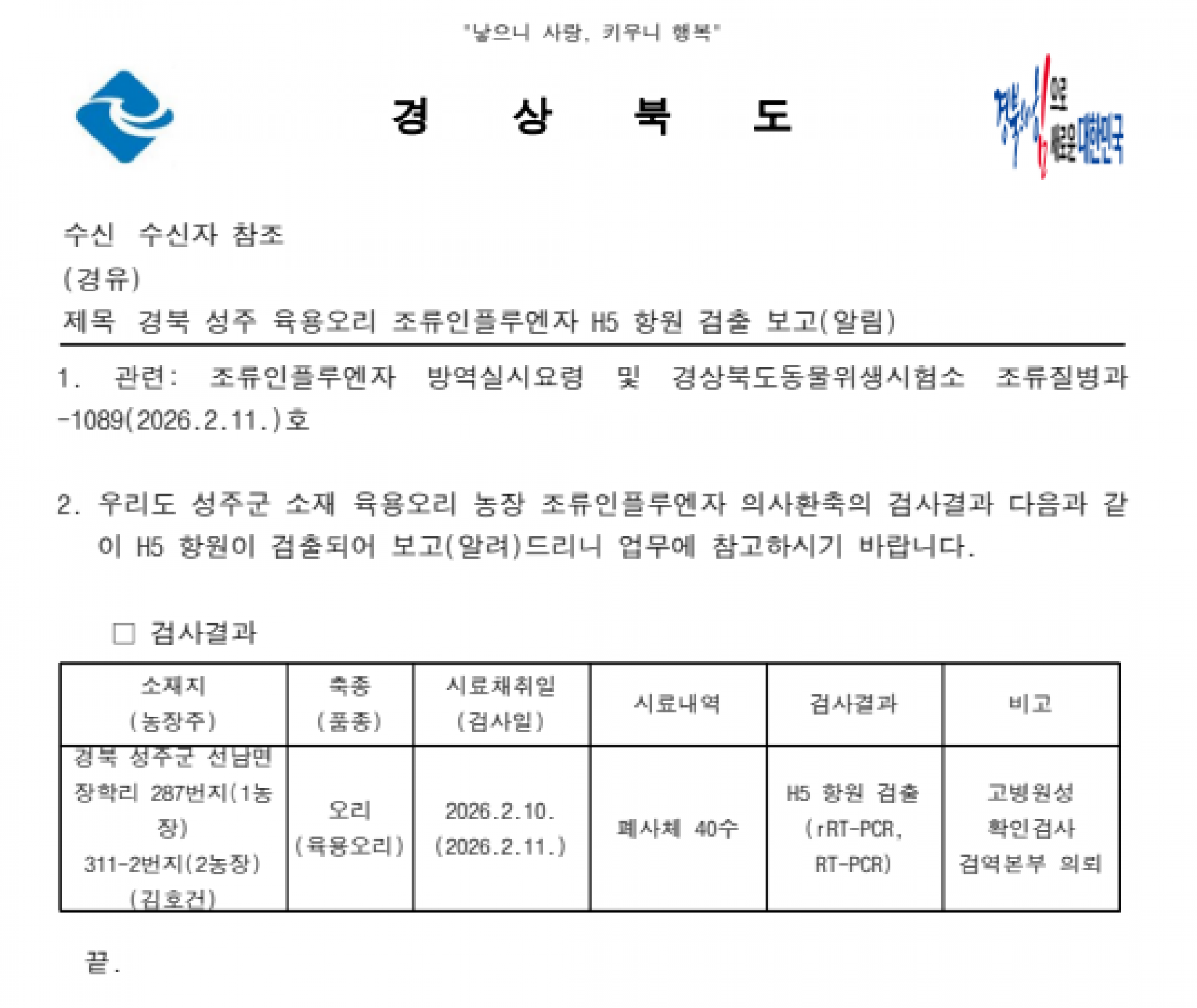 경북 성주 가금농장(육용오리) 고병원성 AI 의사환축 발생에 따른 방역강화 조치